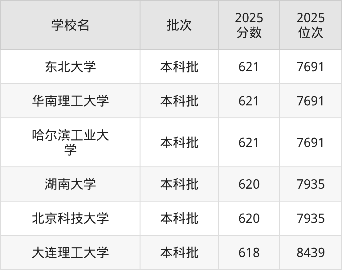 2025年辽宁高考物理类619分(7936名~8169名)录取位次低于该区间(较稳妥)的有大连理工大学(8439名)、上海外国语大学(8681名)等;录取位次高于该区间(可冲)的有北京科技大学(7935名)、湖南大学(7935名)等。