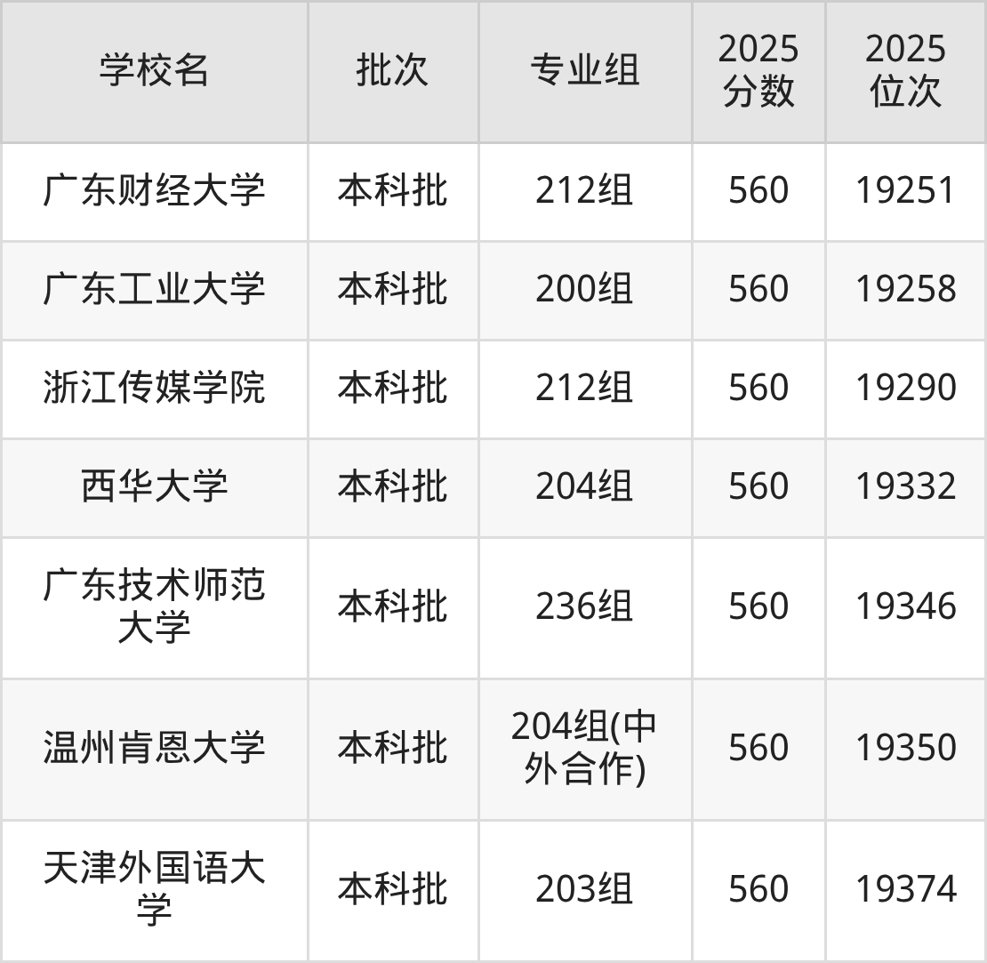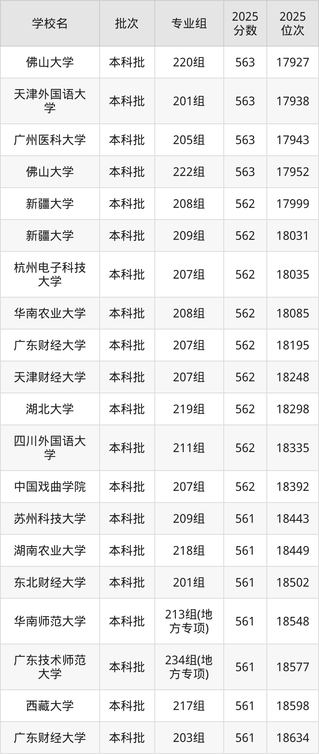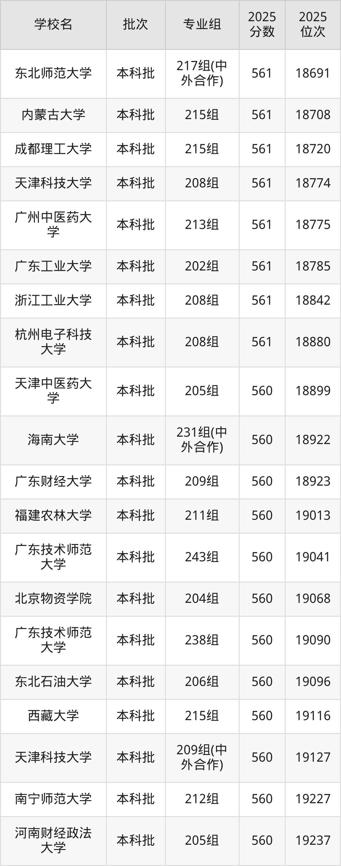 2025年广东高考历史类561分(18409名~18892名)能上的大学有天津科技大学208组、内蒙古大学215组、东北财经大学201组、东北师范大学217组(中外合作)等。