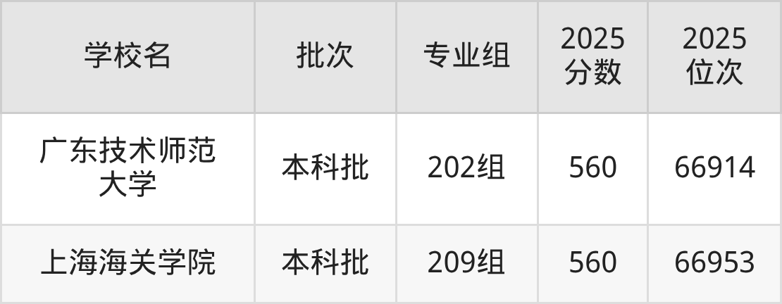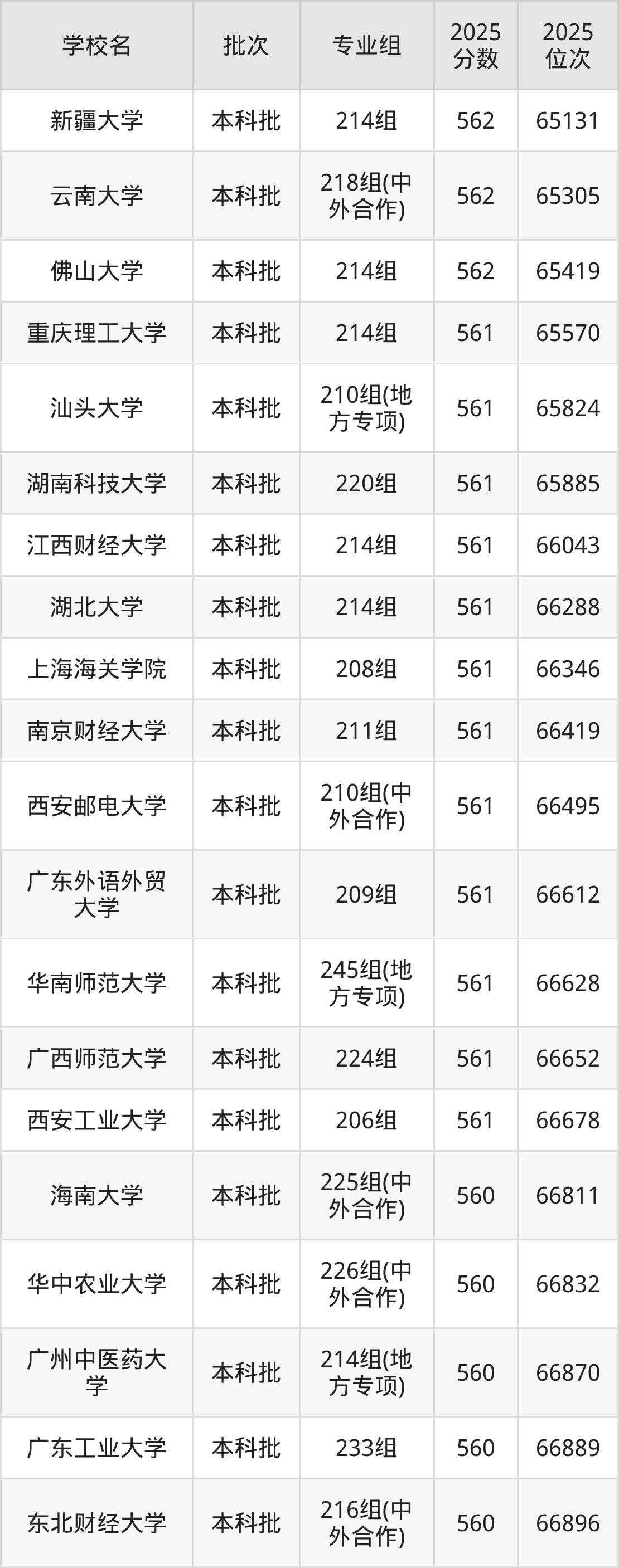 2025年广东高考物理类561分(65511名~66789名)能上的大学有上海海关学院208组、南京财经大学211组、江西财经大学214组、湖北大学214组等。