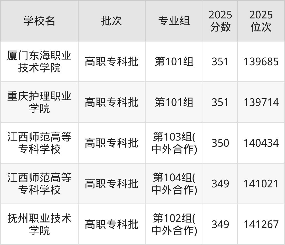 另外录取位次低于该区间(较稳妥)的有江西师范高等专科学校第104组(中外合作)(141021名)、抚州职业技术学院第102组(中外合作)(141267名)等;录取位次高于该区间(可冲)的有重庆护理职业学院第101组(139714名)、厦门东海职业技术学院第101组(139685名)等。