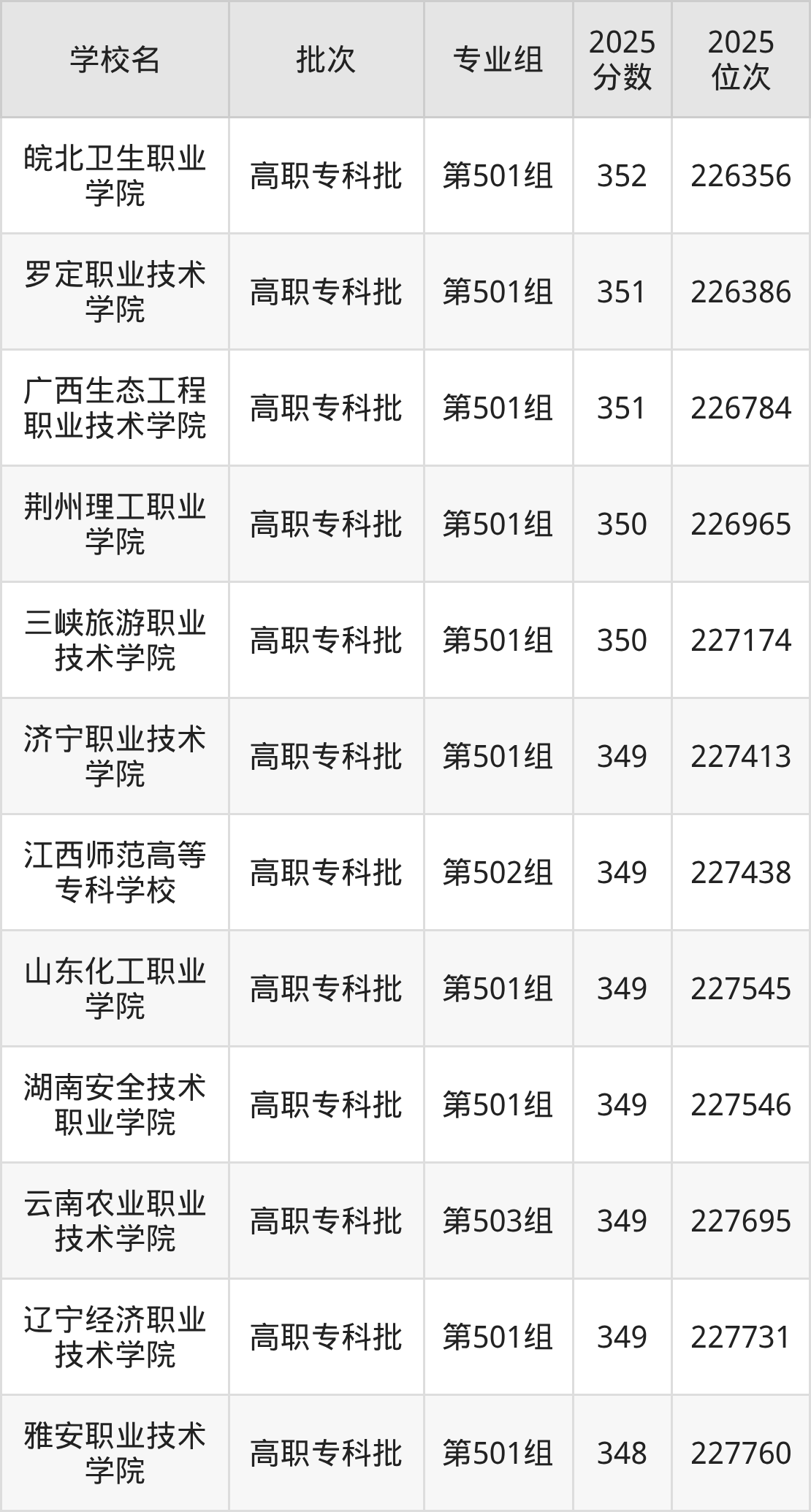 2025年江西高考物理类350分(226829名~227280名)能上的大学有荆州理工职业学院第501组、三峡旅游职业技术学院第501组。