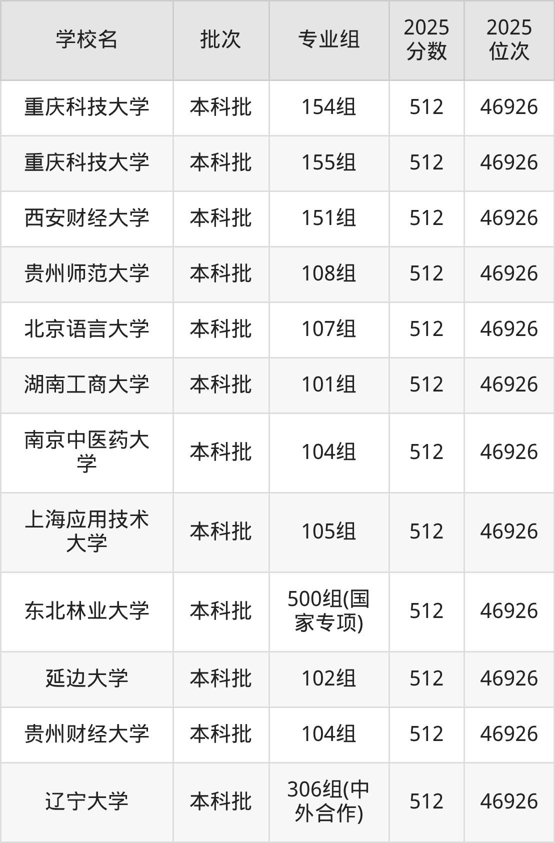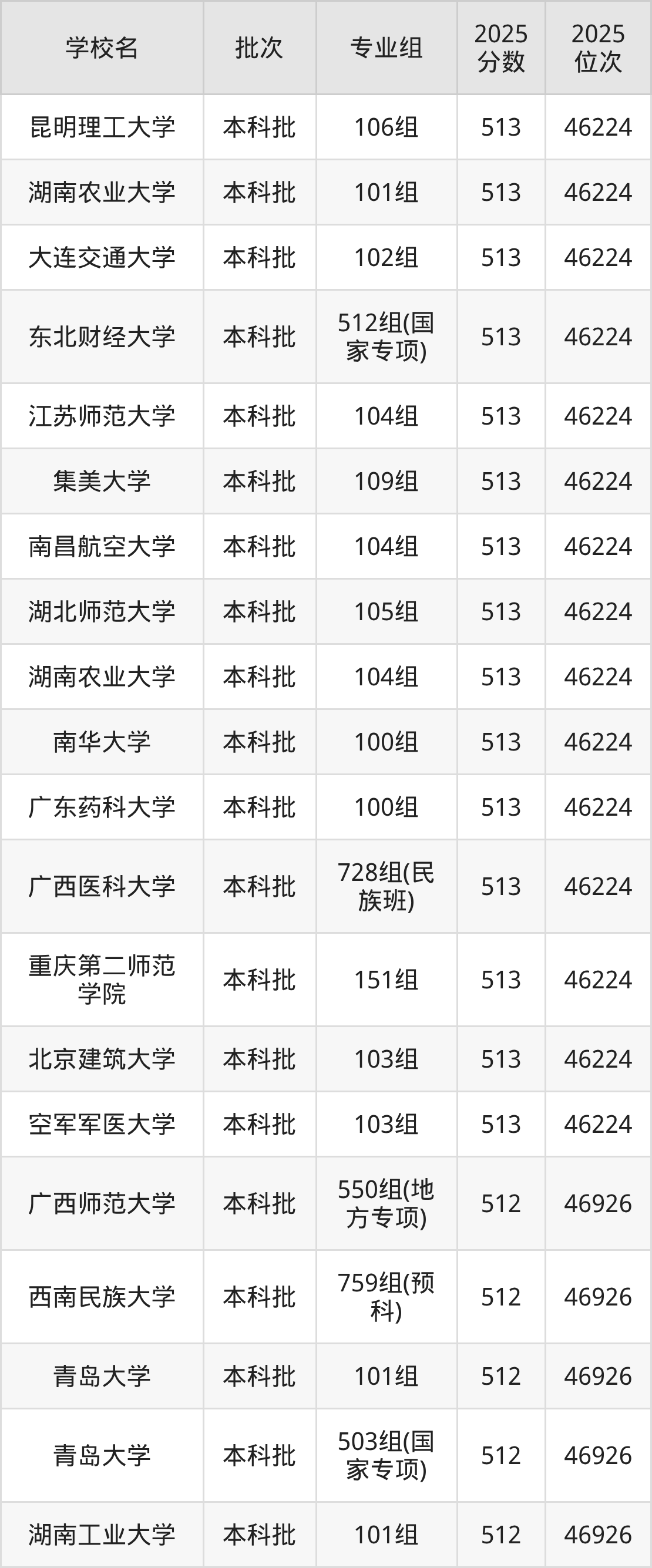 2025年广西高考物理类512分(46225名~46926名)能上的大学有北京语言大学107组、辽宁大学306组(中外合作)、延边大学102组、东北林业大学500组(国家专项)等。