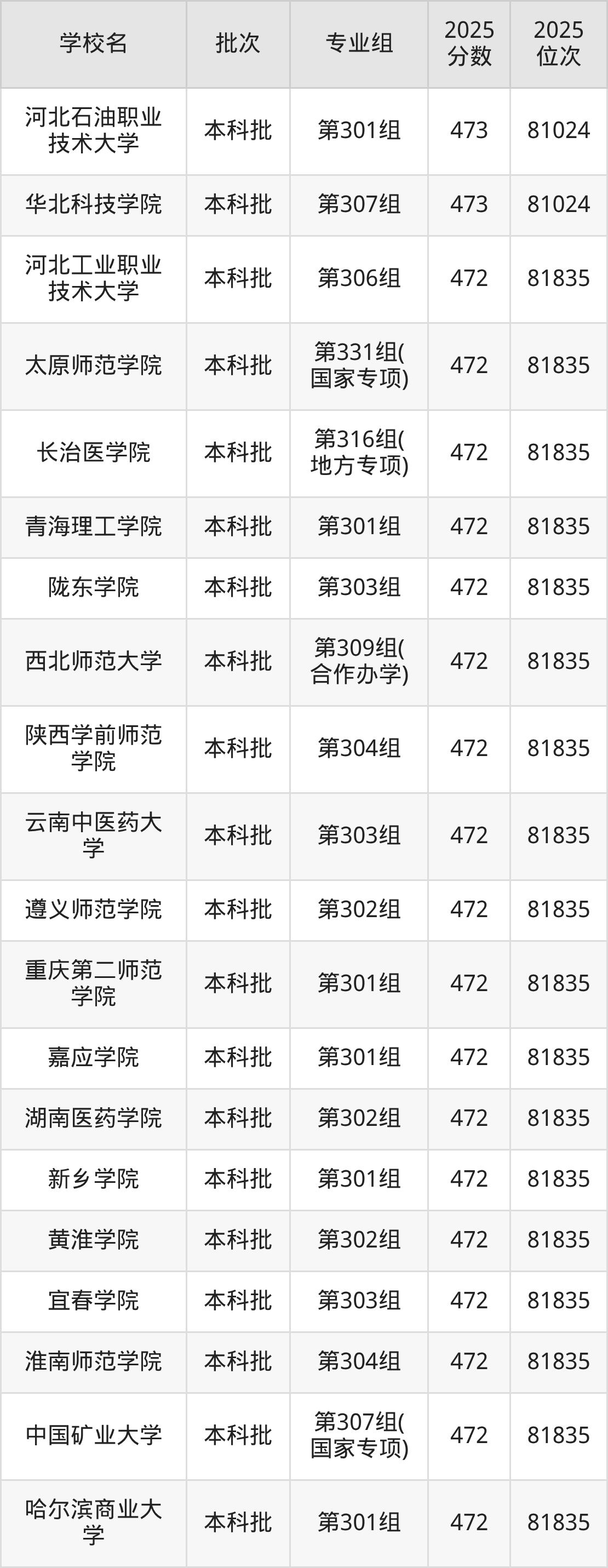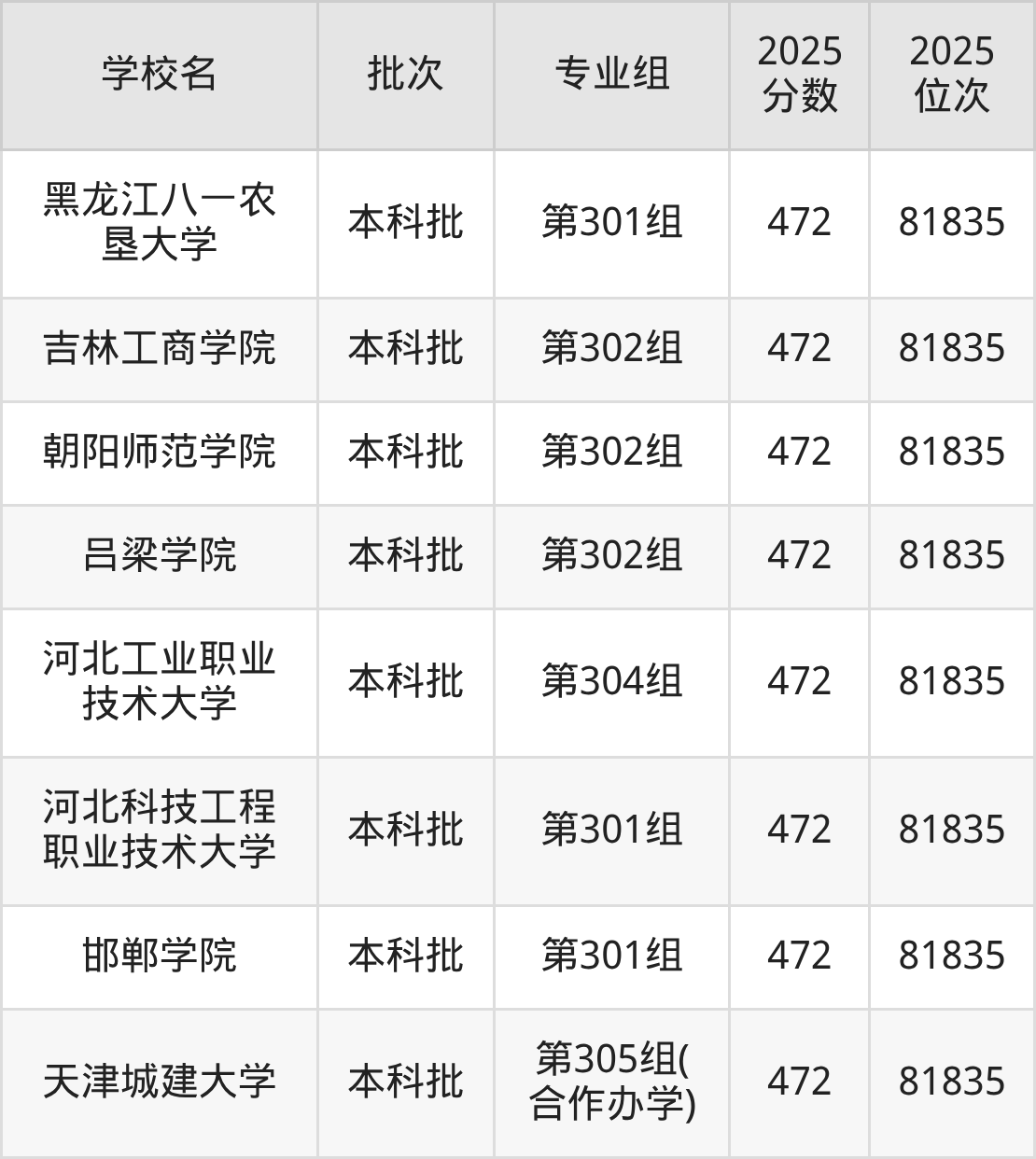 2025年山西高考物理类472分(81025名~81835名)能上的大学有天津城建大学第305组(合作办学)、邯郸学院第301组、河北科技工程职业技术大学第301组、河北工业职业技术大学第304组等。
