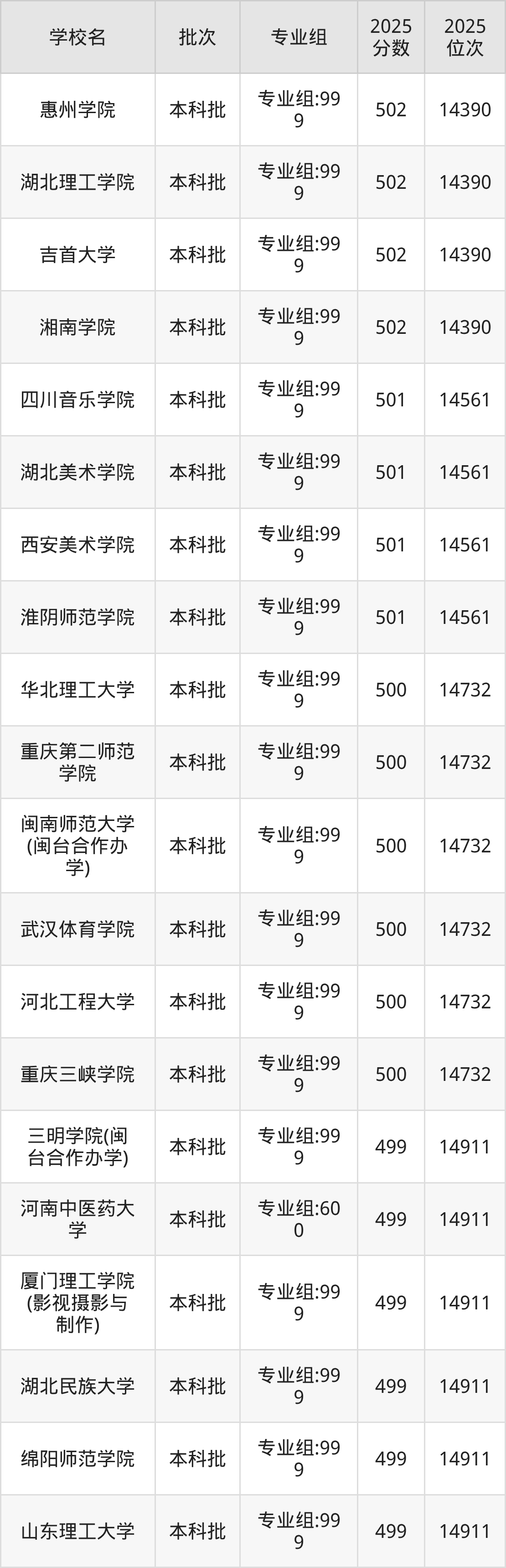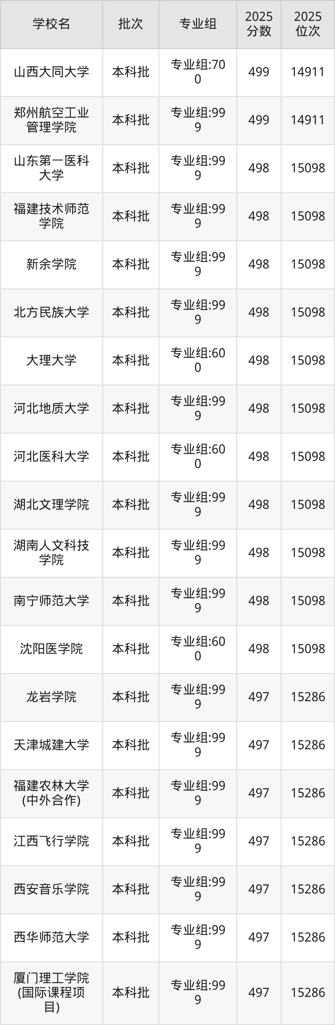 2025年福建高考历史类499分(14733名~14911名)能上的大学有三明学院(闽台合作办学)专业组:999、厦门理工学院(影视摄影与制作)专业组:999、河南中医药大学专业组:600、湖北民族大学专业组:999等。