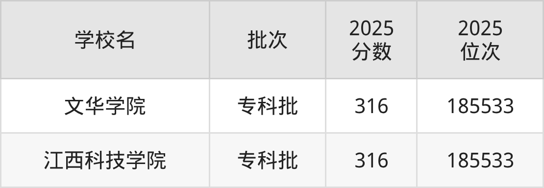 2025年河北高考历史类315分(185534名~186176名)录取位次低于该区间(较稳妥)的有北京网络职业学院(186809名)、陕西服装工程学院(186809名)等;录取位次高于该区间(可冲)的有文华学院(185533名)、江西科技学院(185533名)等。