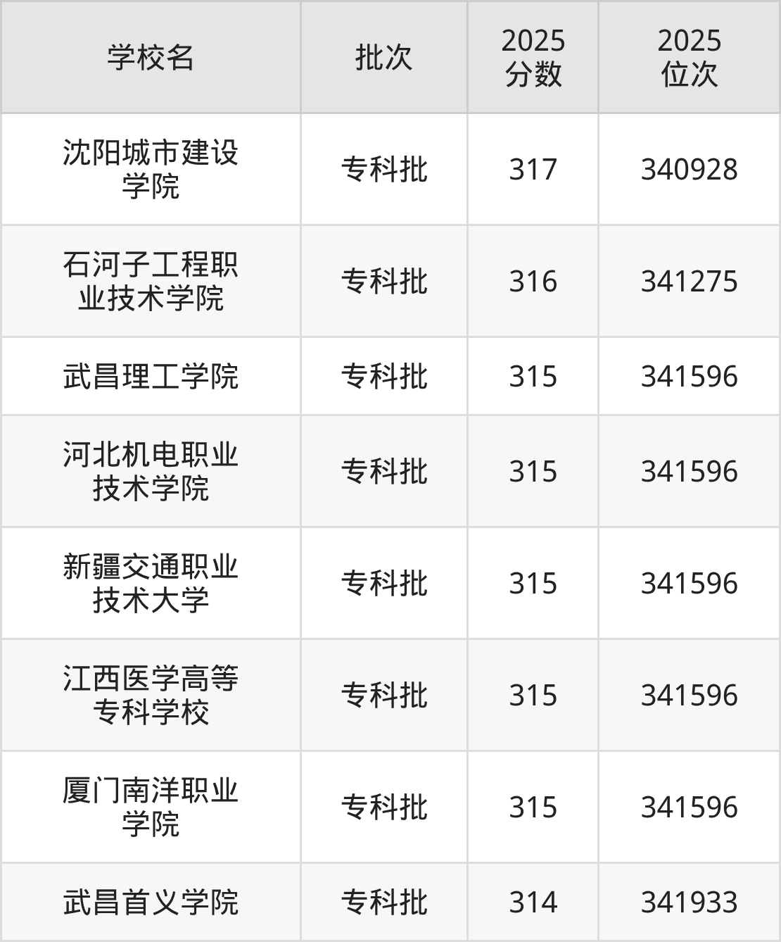 2025年河北高考物理类315分(341276名~341596名)能上的大学有新疆交通职业技术大学、江西医学高等专科学校、厦门南洋职业学院、武昌理工学院等。