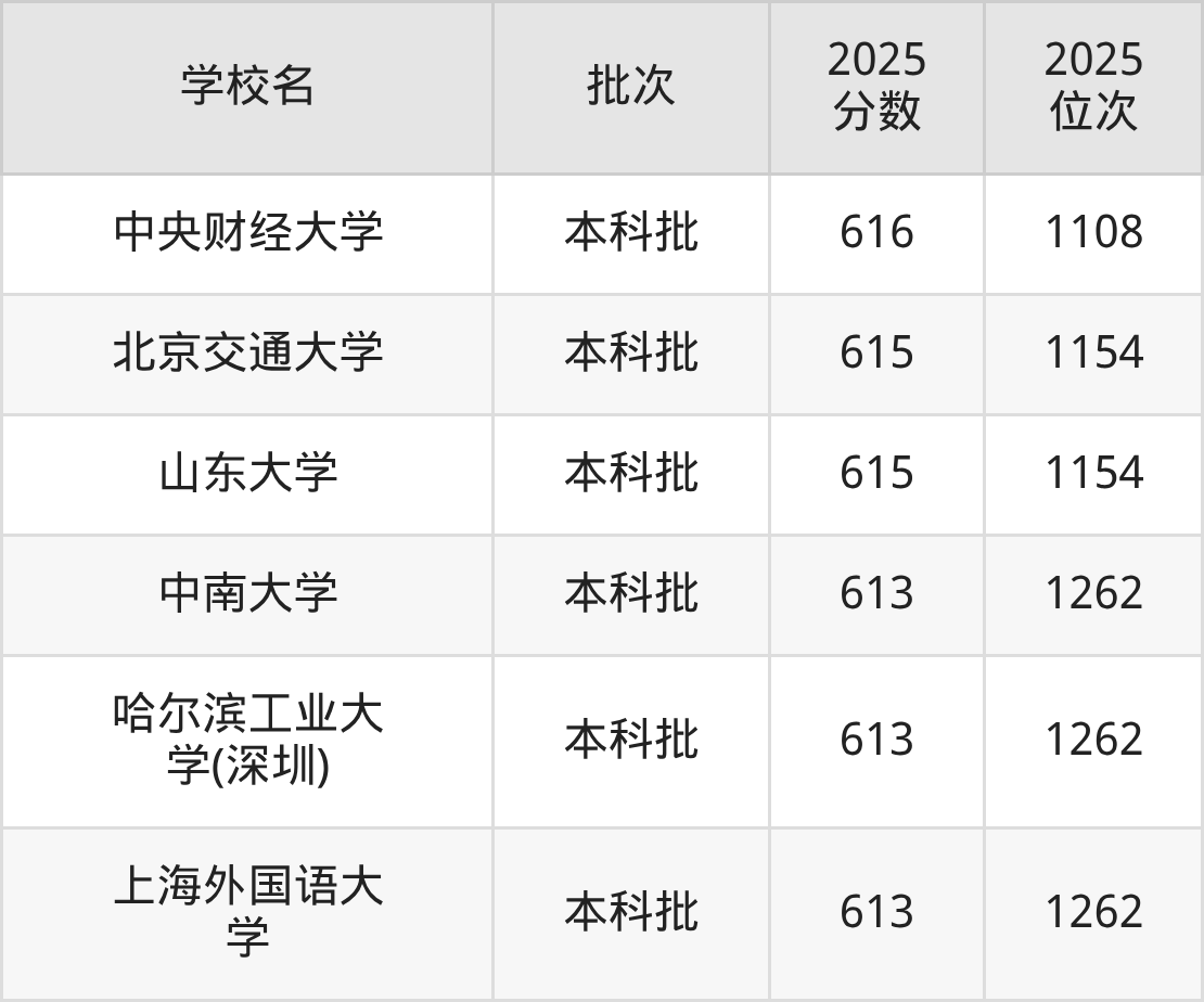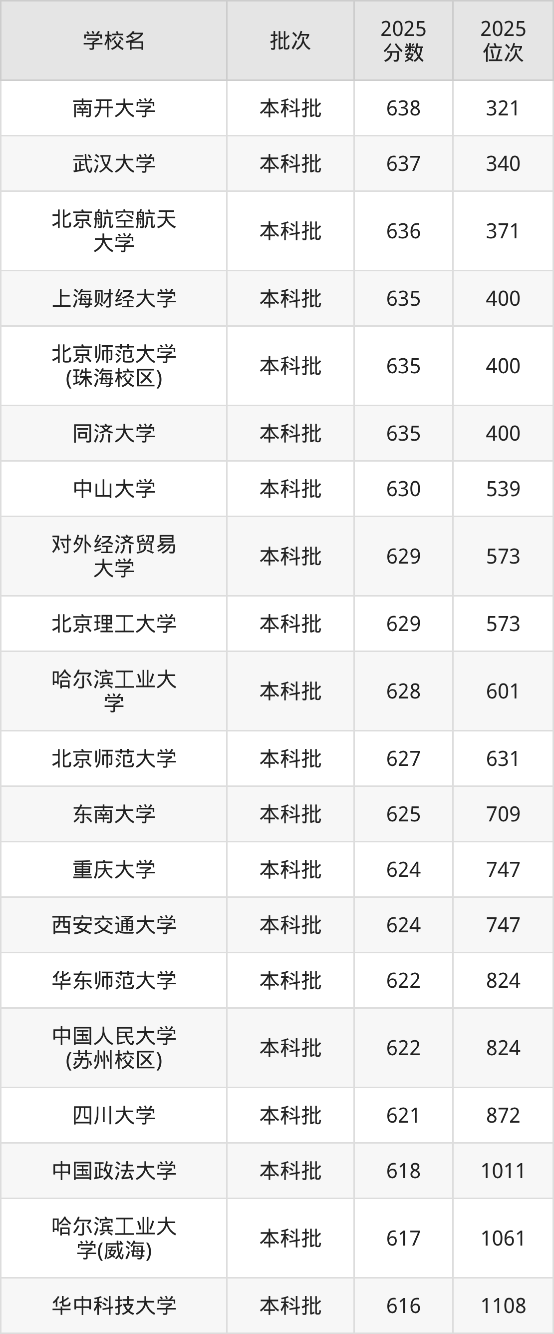 由于高考录取分数线历年波动较大,因此本文以该分数对应的位次排名为大家整理能上的大学名单。