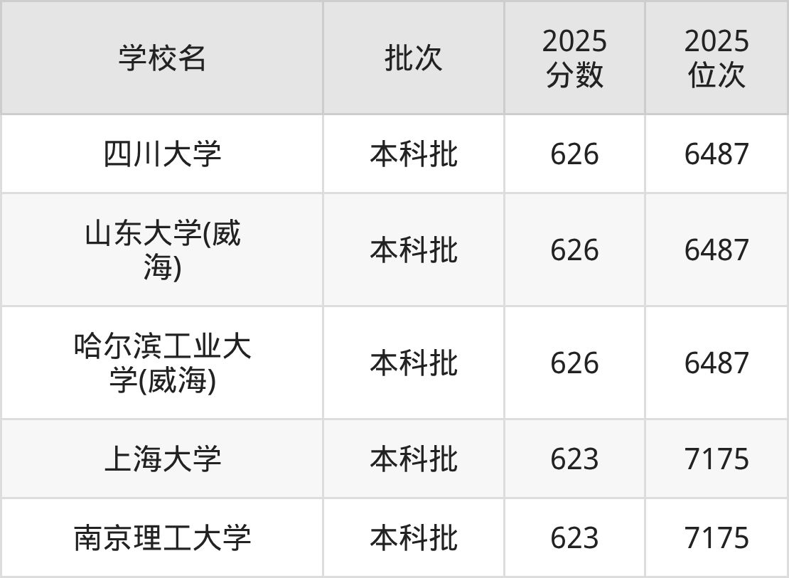 另外录取位次低于该区间(较稳妥)的有哈尔滨工业大学(7691名)、华南理工大学(7691名)等;录取位次高于该区间(可冲)的有山东大学(威海)(6487名)、哈尔滨工业大学(威海)(6487名)等。