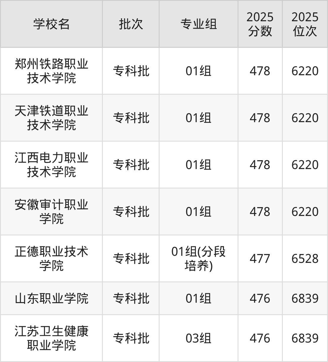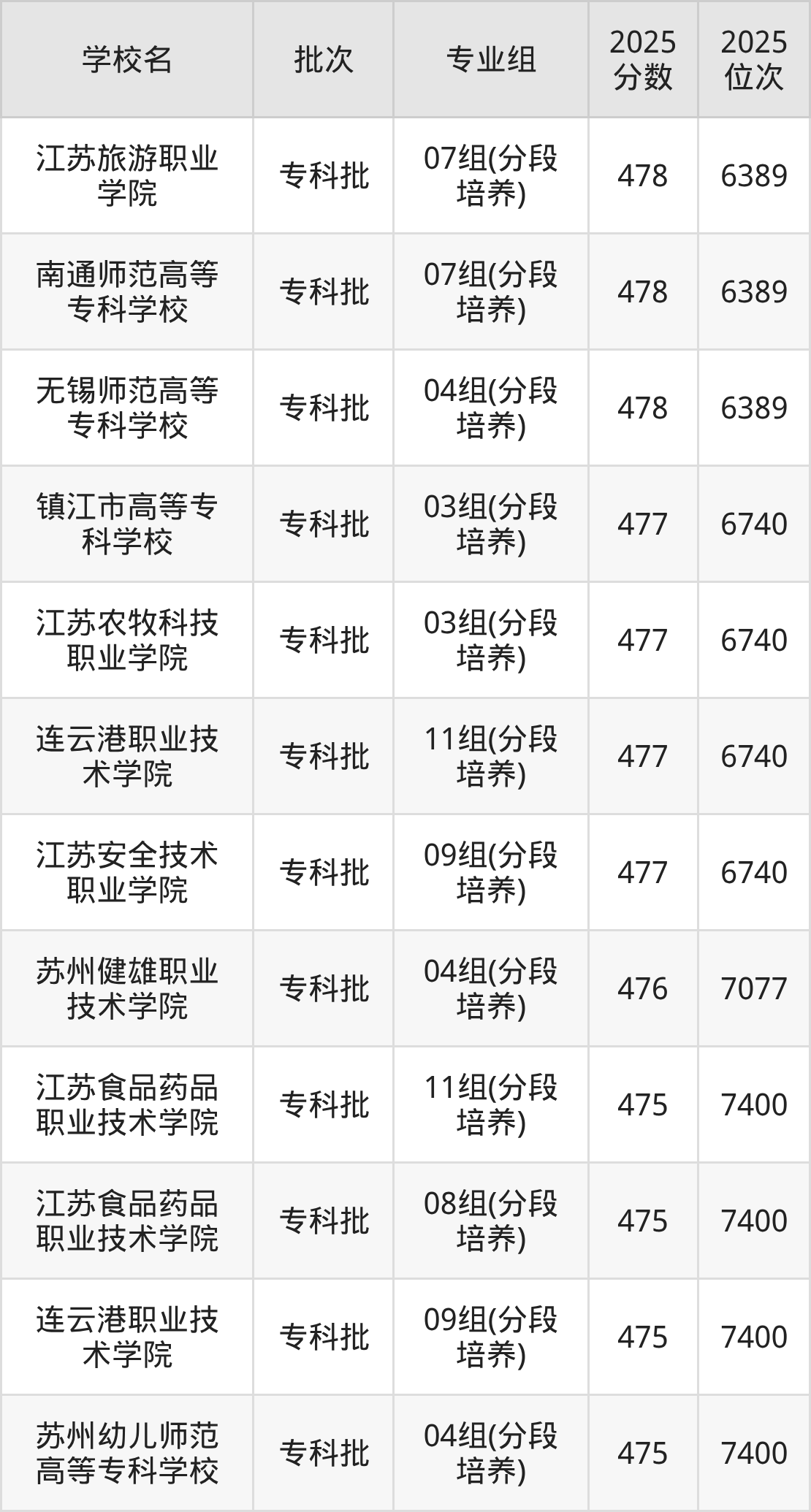2025年江苏高考历史类476分(6529名~6839名)能上的大学有江苏卫生健康职业学院03组、山东职业学院01组。