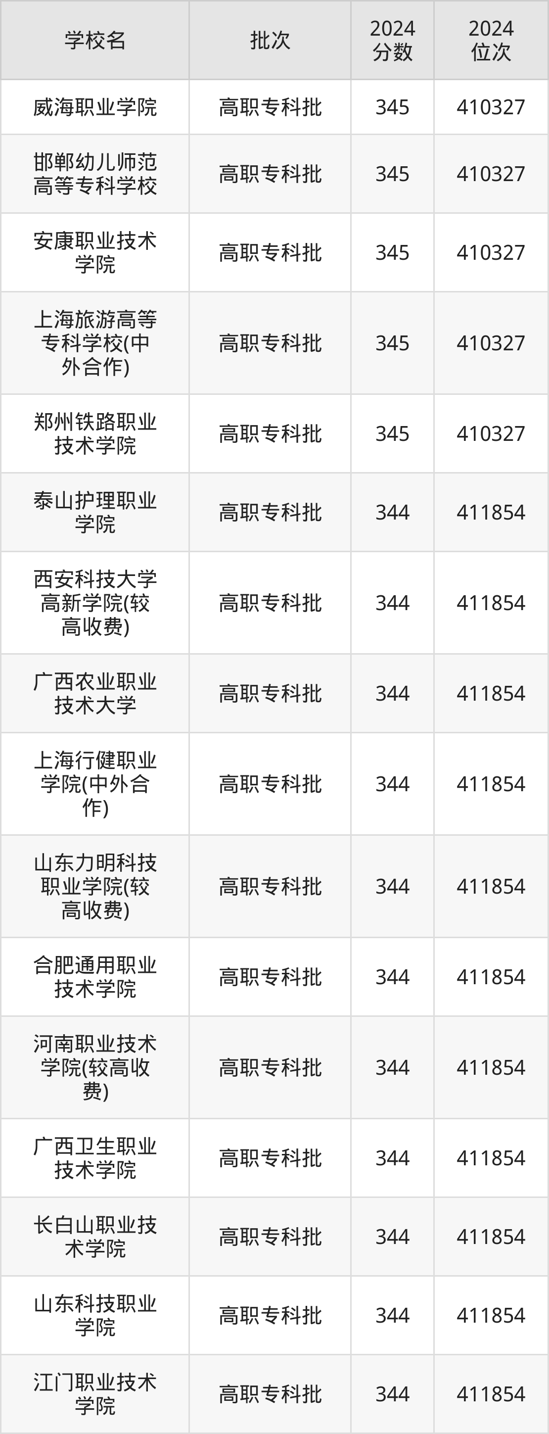 2024年河南高考理科344分(410329名~411855名)能上的大学有广西农业职业技术大学、江门职业技术学院、山东科技职业学院、长白山职业技术学院等。