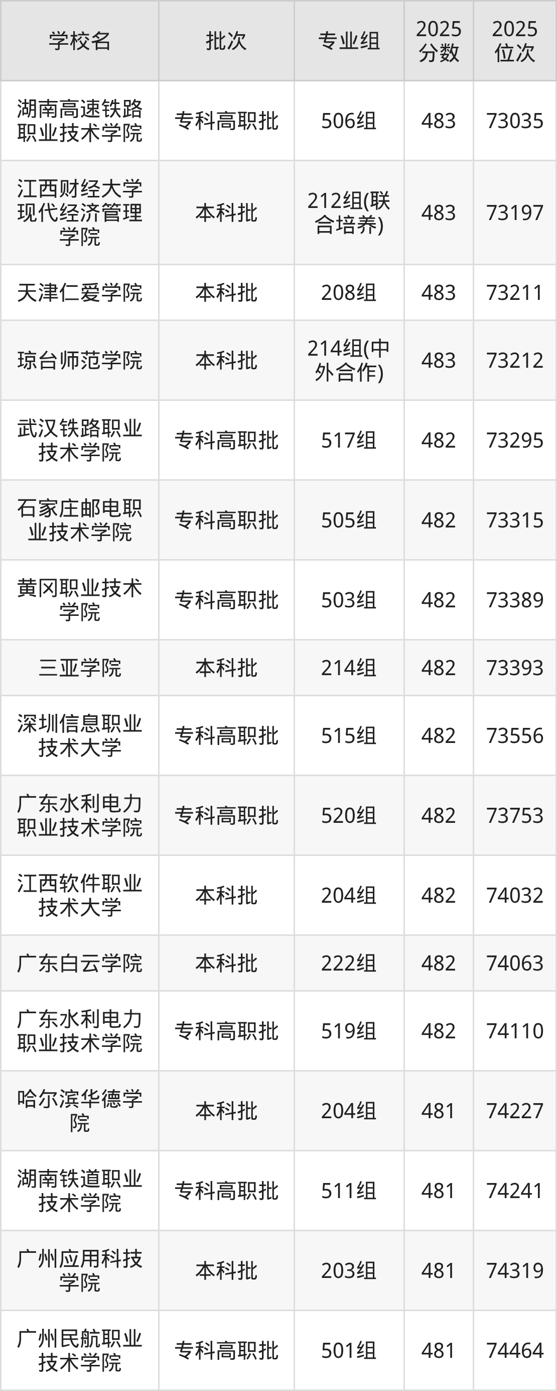 2025年广东高考历史类482分(73264名~74189名)能上的大学有广东白云学院222组、江西软件职业技术大学204组、三亚学院214组、广东水利电力职业技术学院519组等。