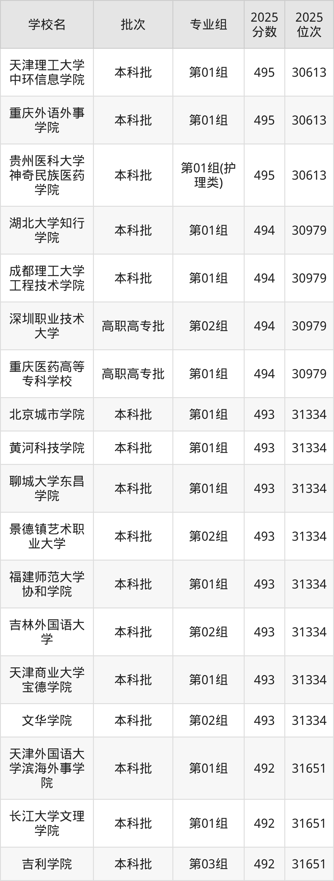 2025年湖北高考历史类493分(30980名~31334名)能上的大学有文华学院第02组、北京城市学院第01组、天津商业大学宝德学院第01组、吉林外国语大学第02组等。