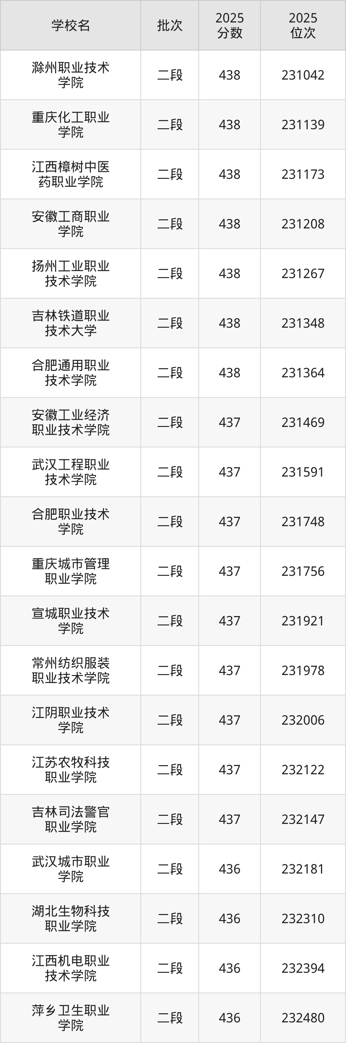 2025年浙江高考437分(231465名~232172名)能上的大学有合肥职业技术学院、吉林司法警官职业学院、安徽工业经济职业技术学院、江阴职业技术学院等。