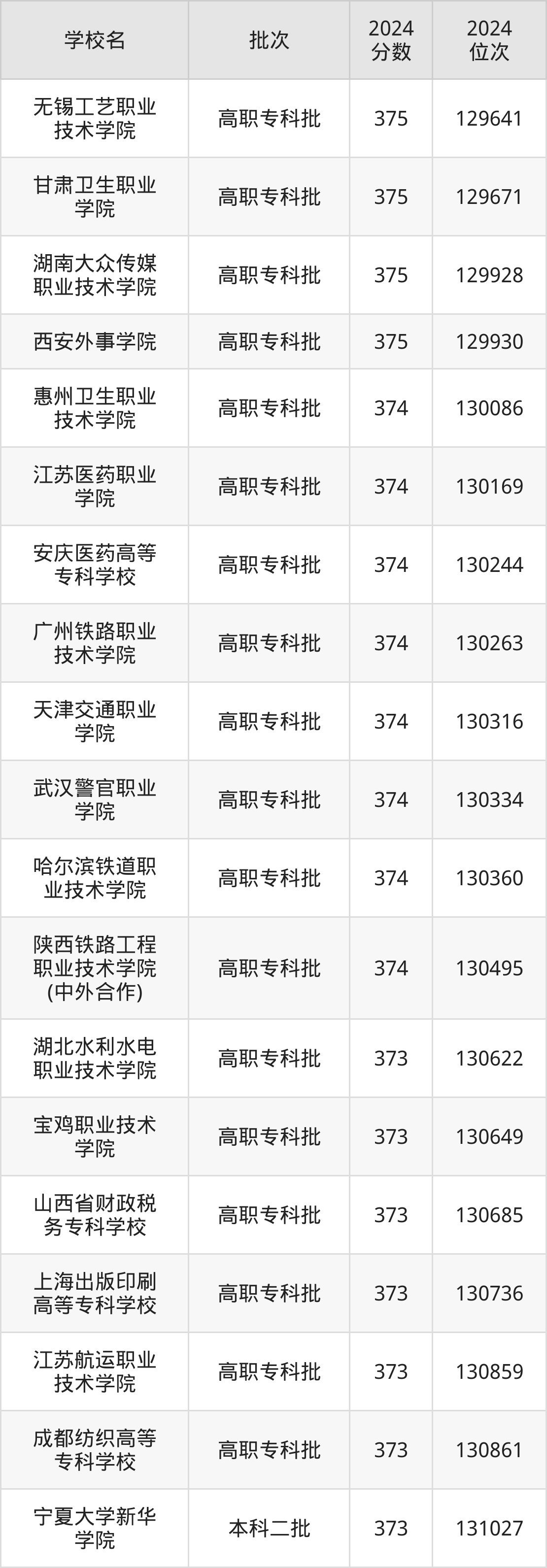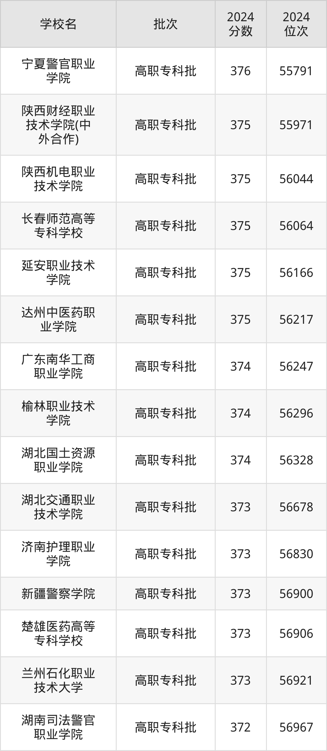 2024年陕西高考文科374分(56246名~56567名)能上的大学有湖北国土资源职业学院、广东南华工商职业学院、榆林职业技术学院。
