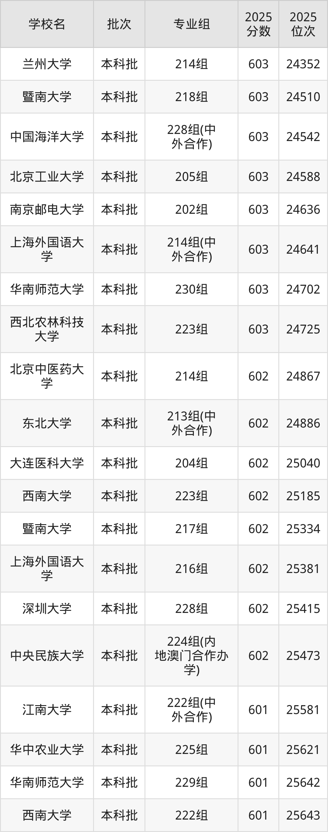 2025年广东高考物理类602分(24759名~25508名)能上的大学有北京中医药大学214组、中央民族大学224组(内地澳门合作办学)、东北大学213组(中外合作)、大连医科大学204组等。