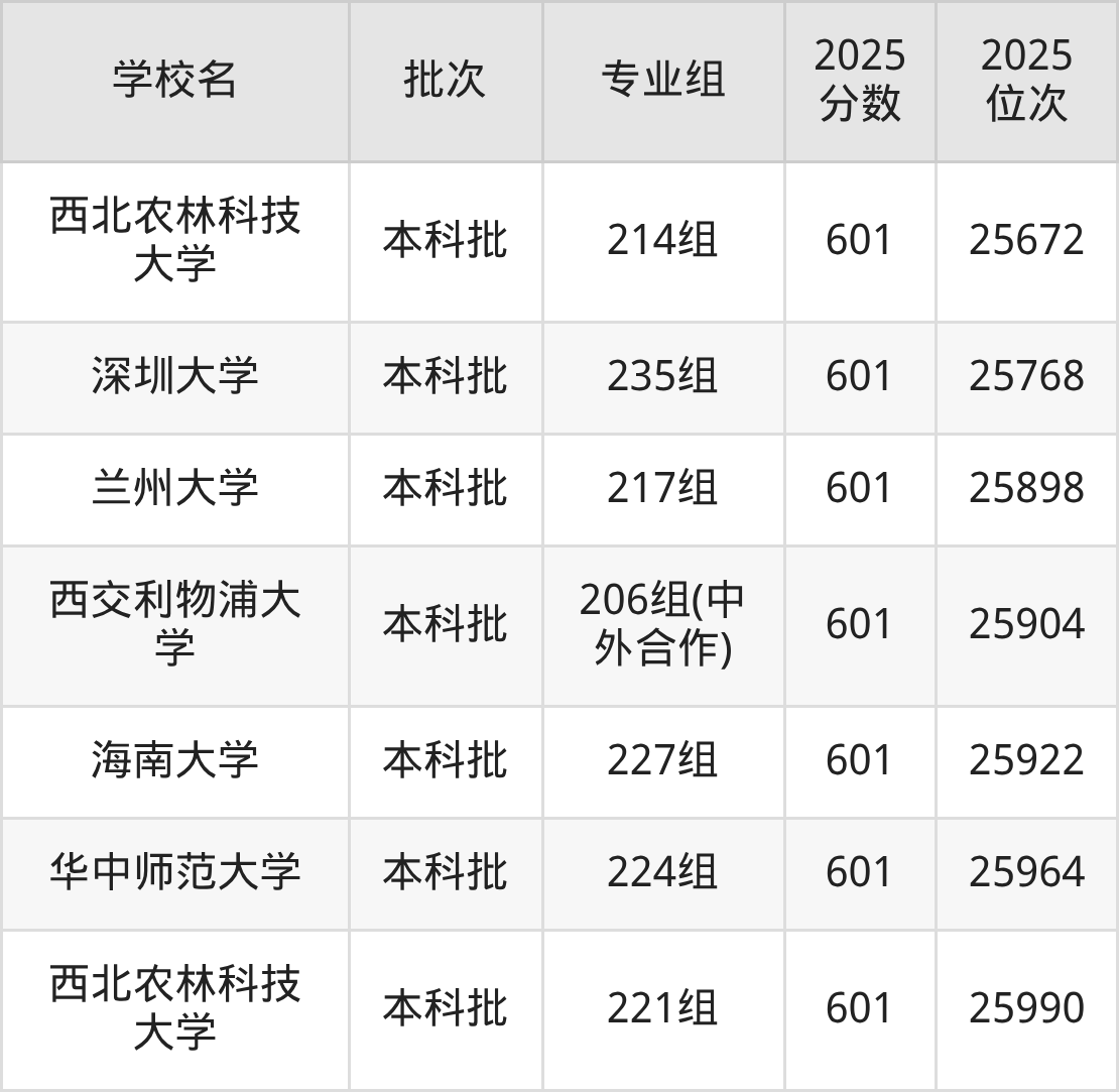 另外录取位次低于该区间(较稳妥)的有江南大学222组(中外合作)(25581名)、华中农业大学225组(25621名)等;录取位次高于该区间(可冲)的有西北农林科技大学223组(24725名)、华南师范大学230组(24702名)等。