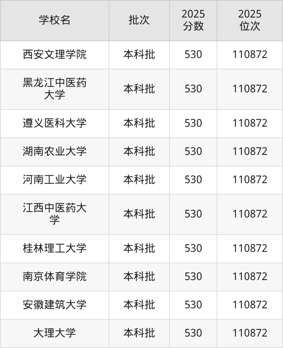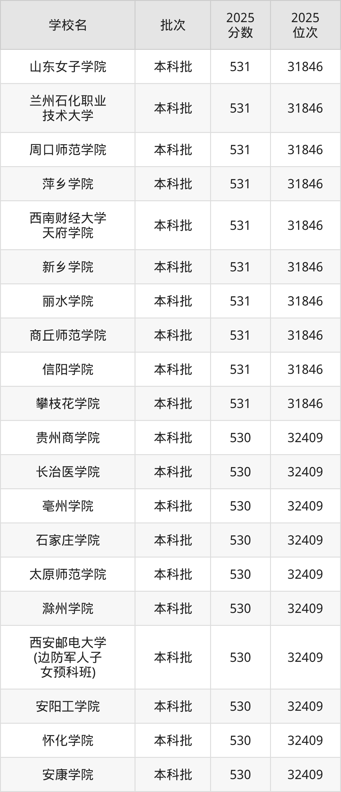 2025年河北高考历史类530分(31847名~32409名)能上的大学有贵州商学院、怀化学院、安康学院、滁州学院等。