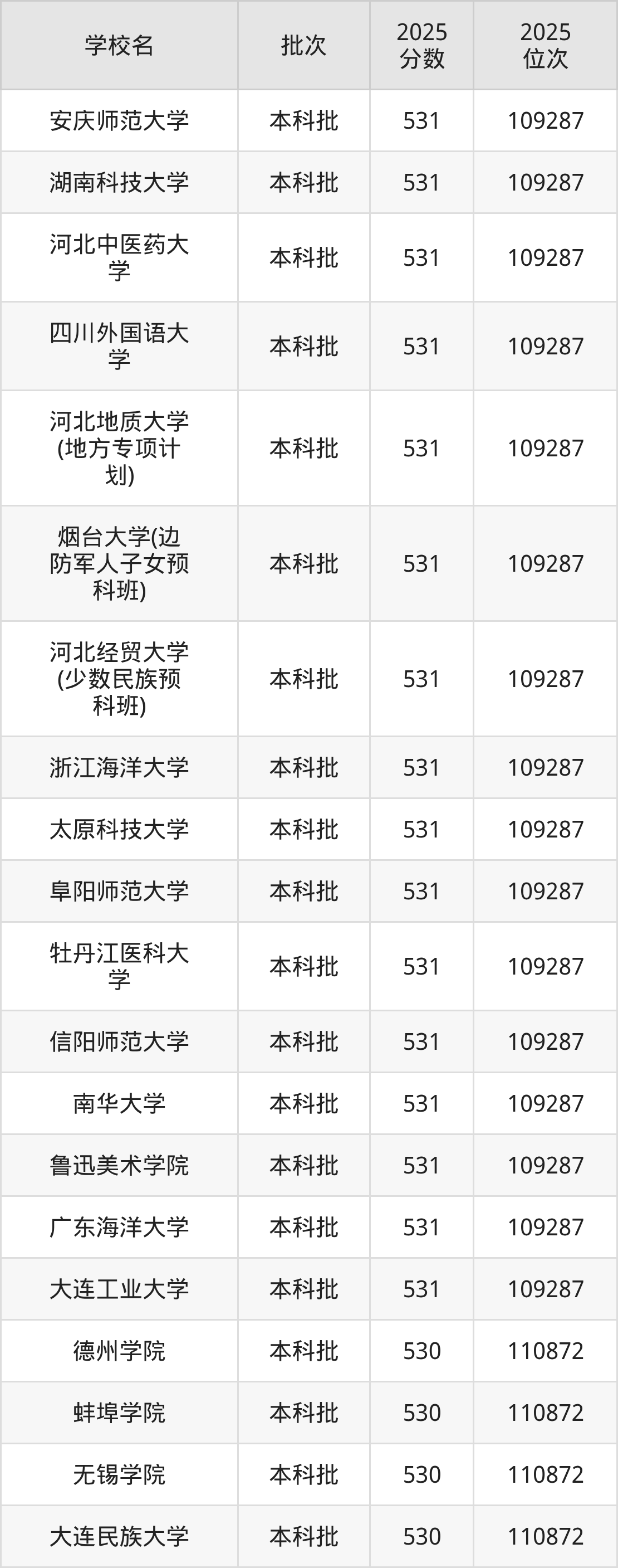 2025年河北高考物理类530分(109288名~110872名)能上的大学有德州学院、蚌埠学院、大理大学、安徽建筑大学等。
