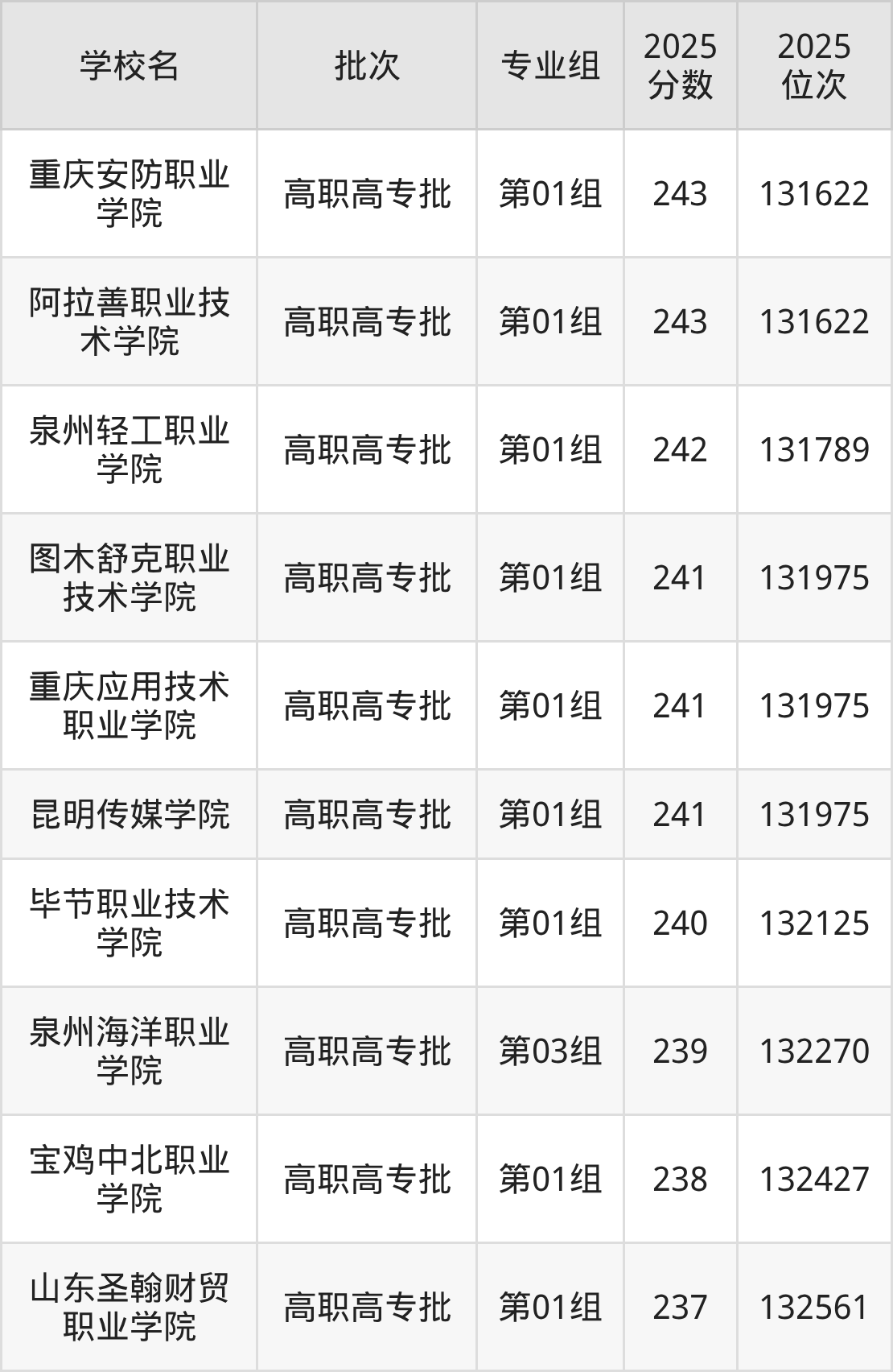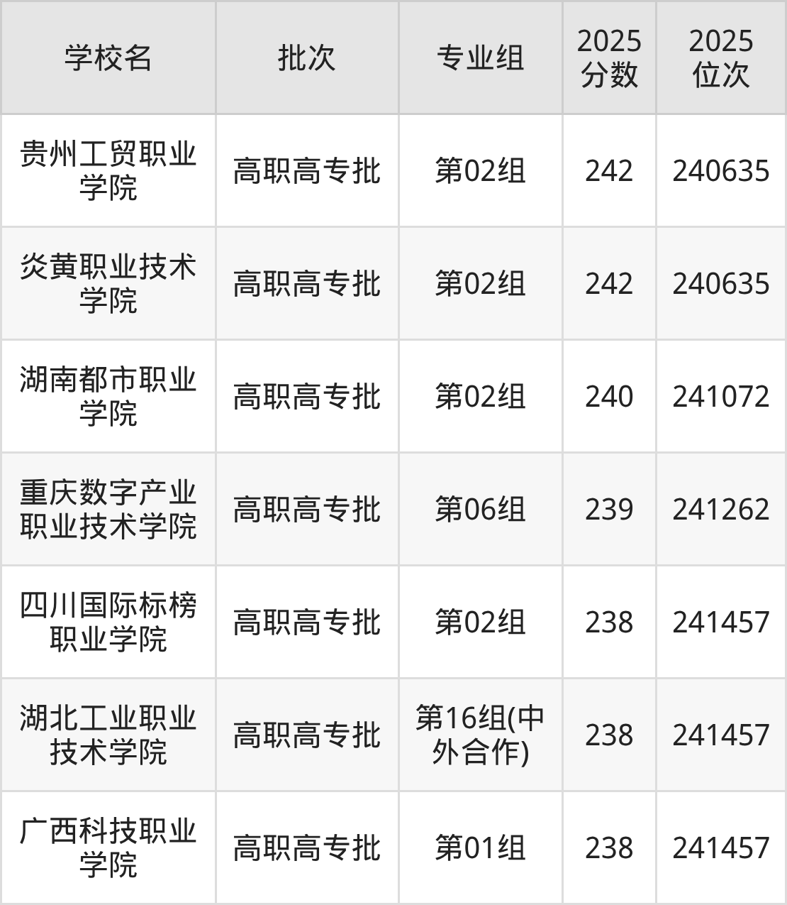 另外录取位次低于该区间(较稳妥)的有重庆数字产业职业技术学院第06组(241262名)、四川国际标榜职业学院第02组(241457名)等;录取位次高于该区间(可冲)的有炎黄职业技术学院第02组(240635名)、贵州工贸职业学院第02组(240635名)等。