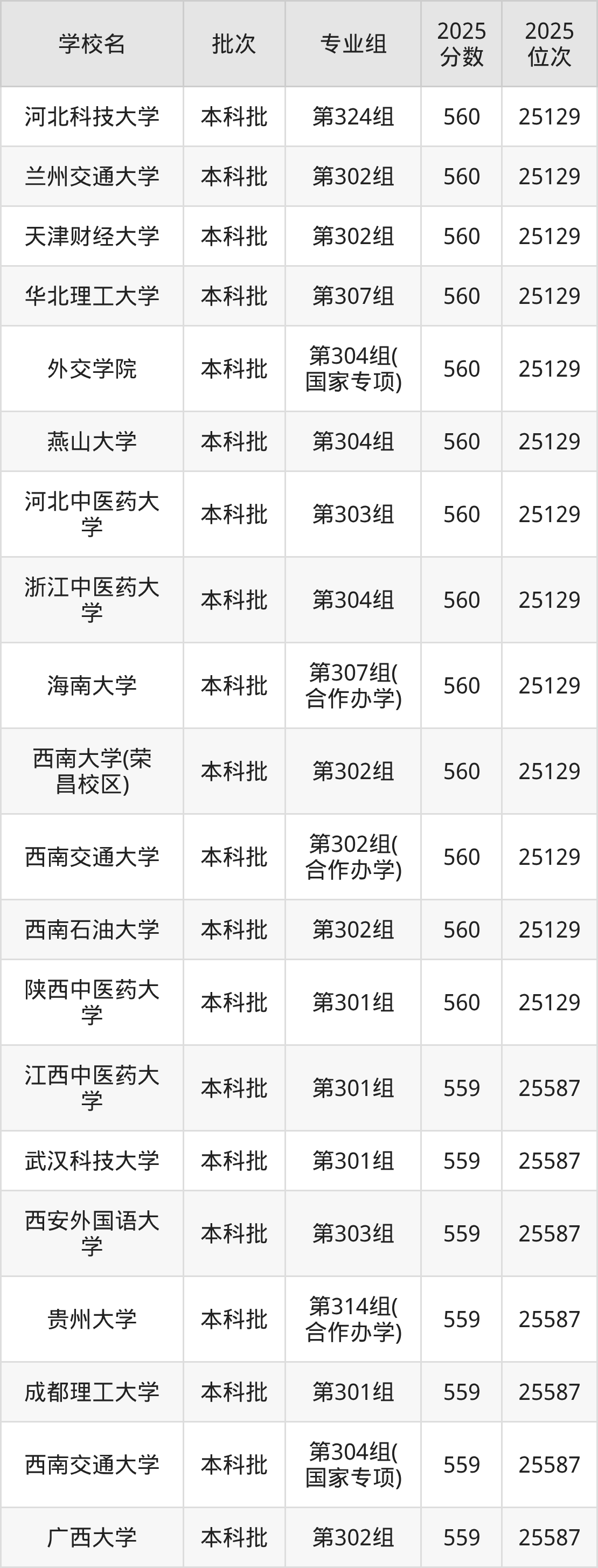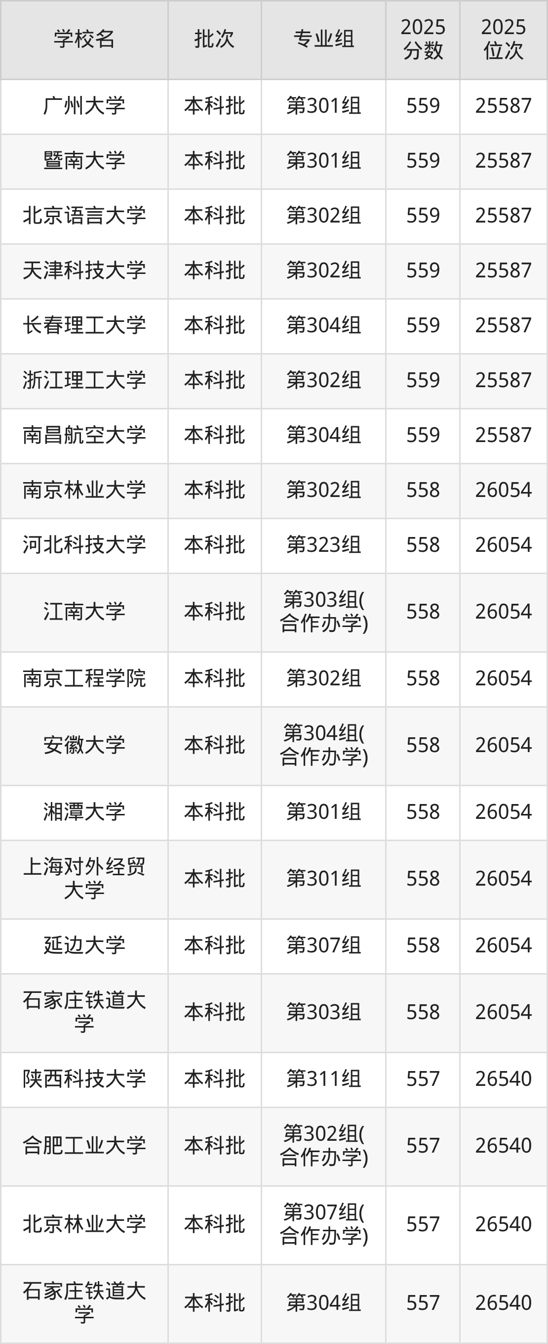2025年山西高考物理类558分(25588名~26054名)能上的大学有河北科技大学第323组、石家庄铁道大学第303组、延边大学第307组、上海对外经贸大学第301组等。