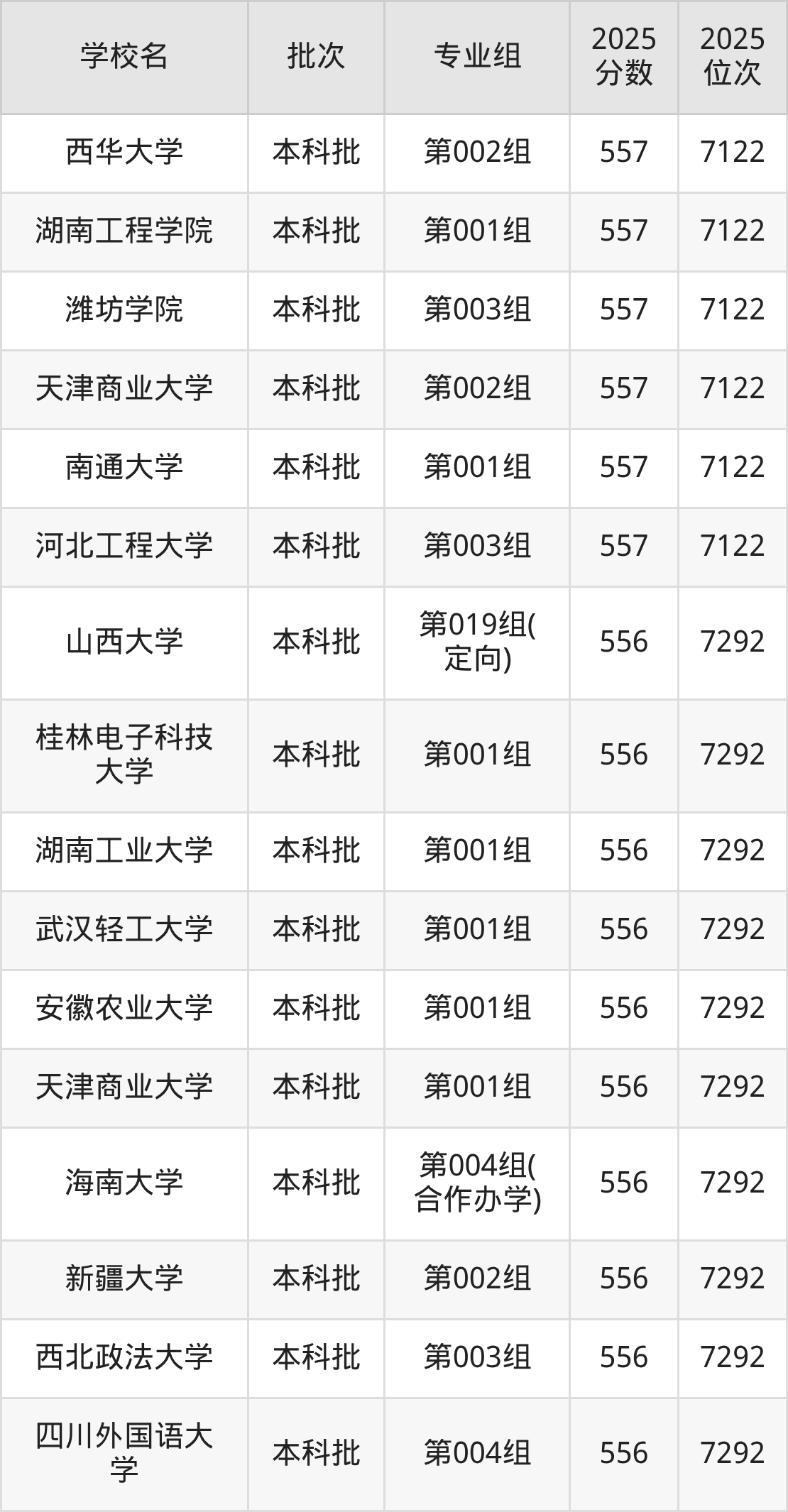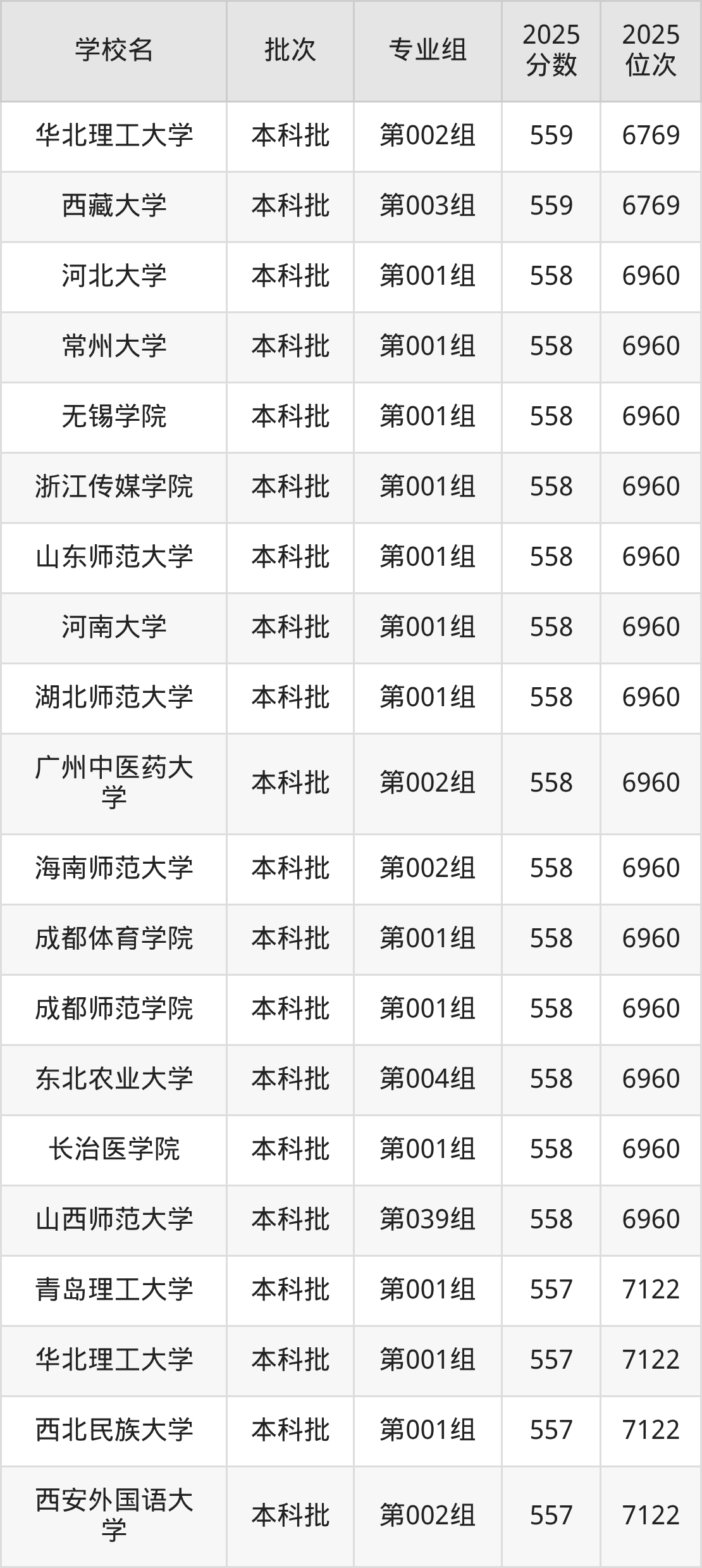 2025年山西高考历史类558分(6770名~6960名)能上的大学有河北大学第001组、东北农业大学第004组、常州大学第001组、无锡学院第001组等。