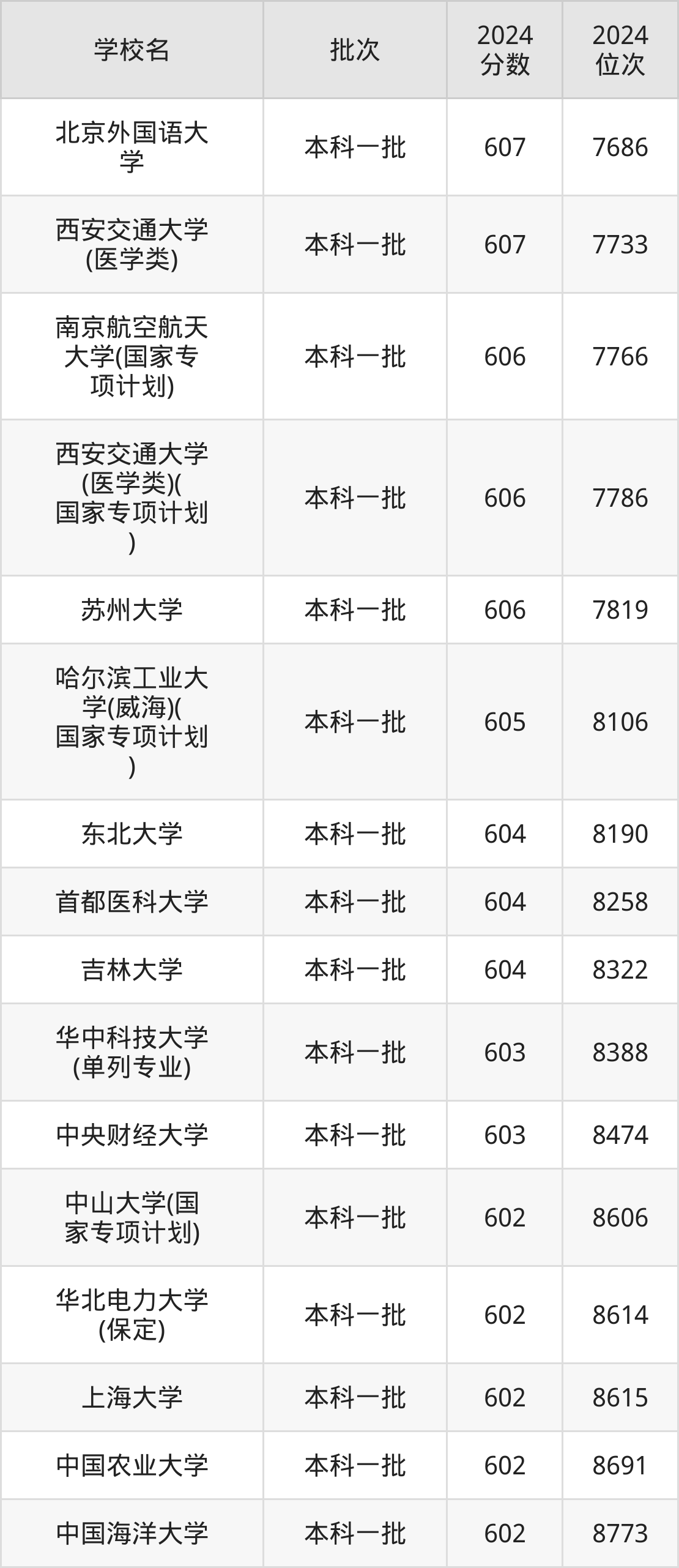 2024年陕西高考理科604分(8145名~8356名)能上的大学有首都医科大学、东北大学、吉林大学。
