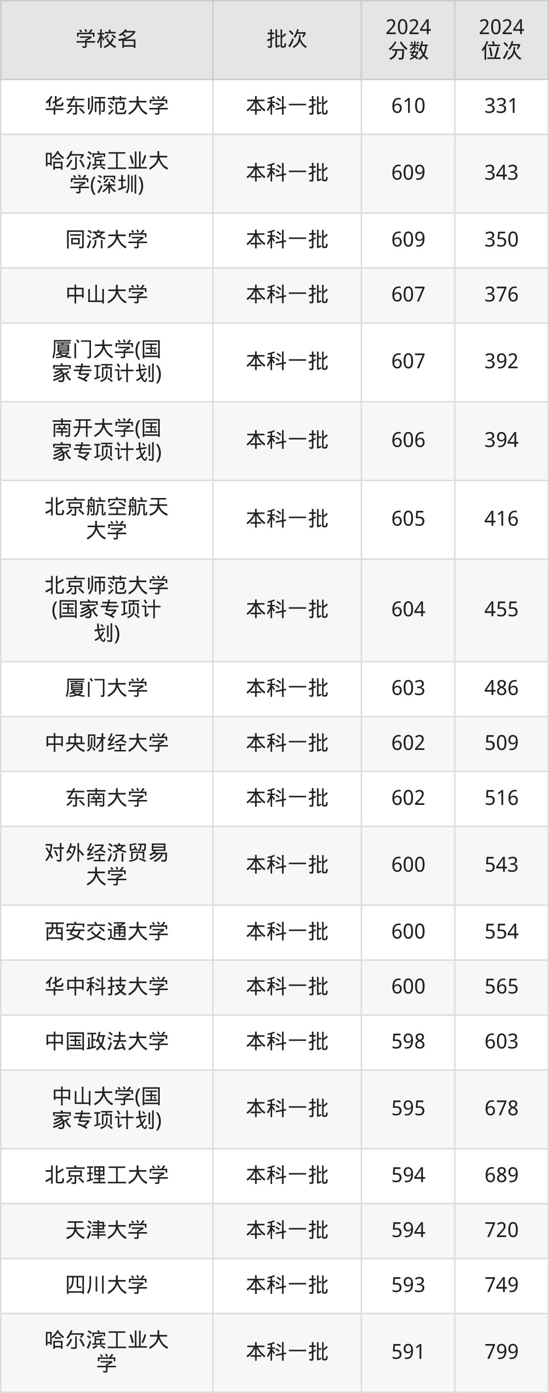 由于高考录取分数线历年波动较大,因此本文以该分数对应的位次排名为大家整理能上的大学名单。