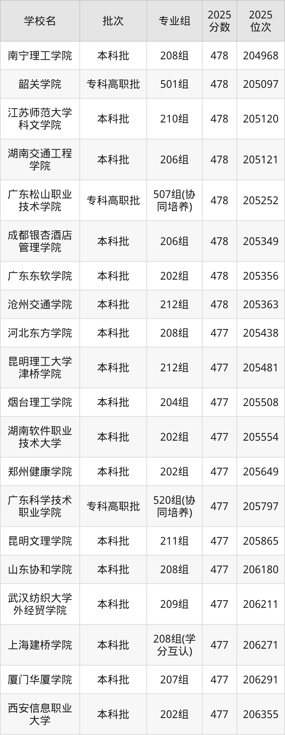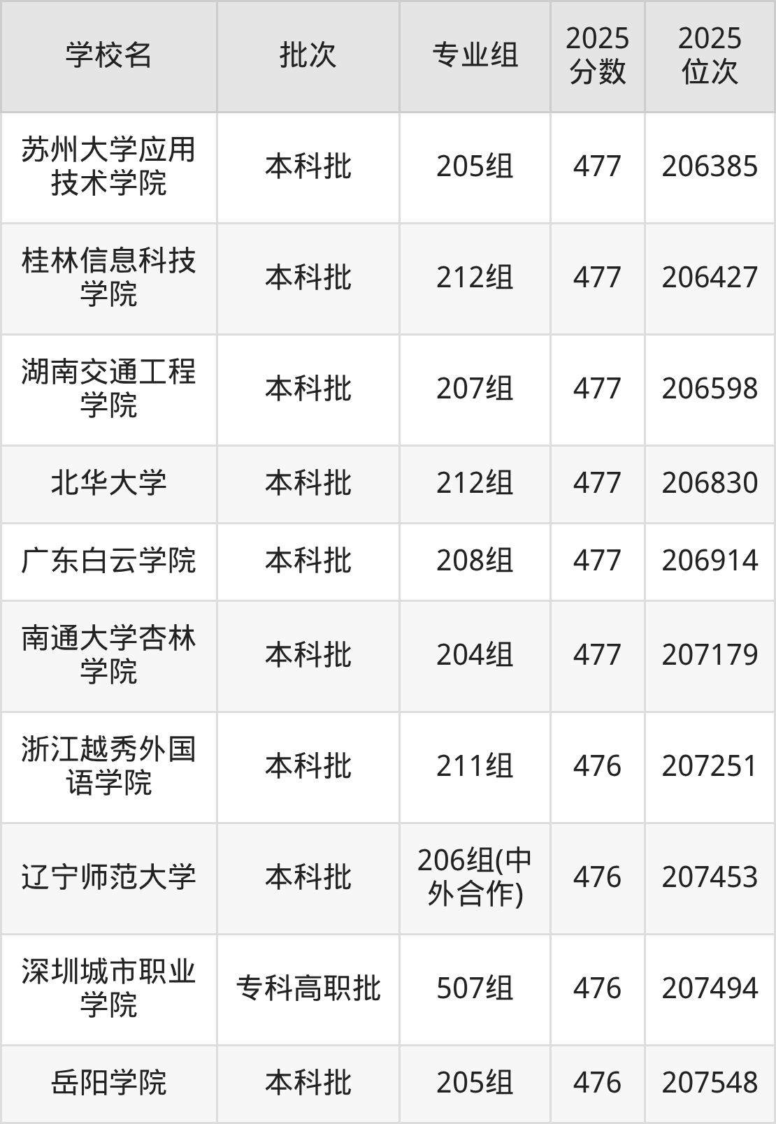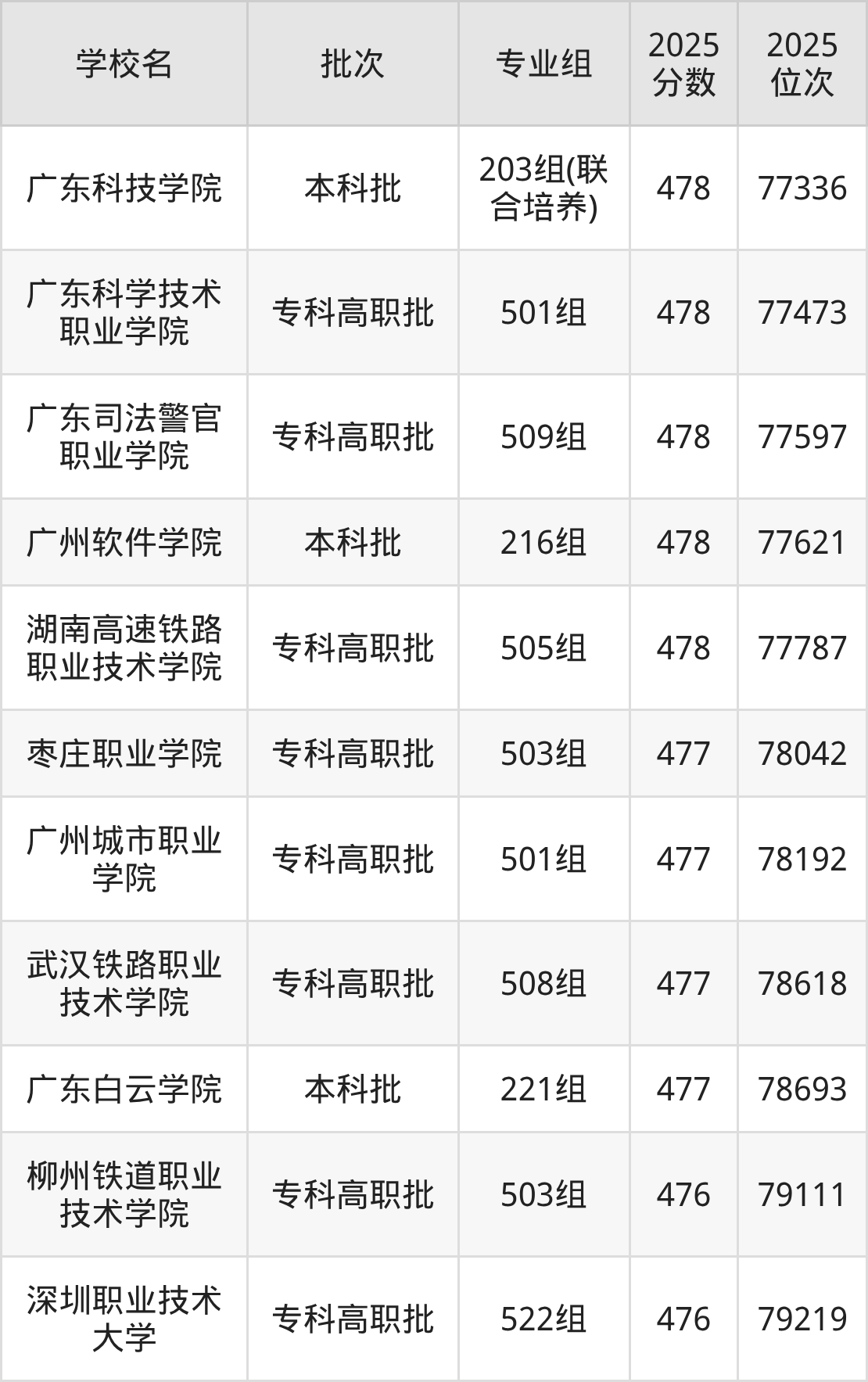 2025年广东高考历史类477分(77822名~78762名)能上的大学有广东白云学院221组、武汉铁路职业技术学院508组、广州城市职业学院501组、枣庄职业学院503组。