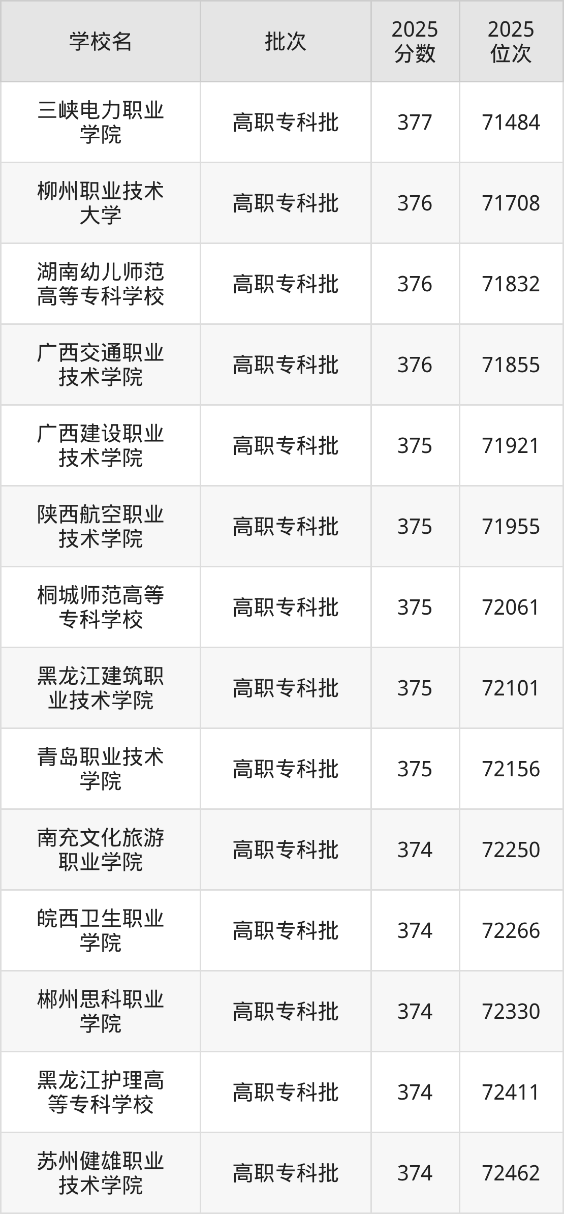 2025年贵州高考历史类375分(71880名~72192名)能上的大学有广西建设职业技术学院、黑龙江建筑职业技术学院、青岛职业技术学院、陕西航空职业技术学院等。