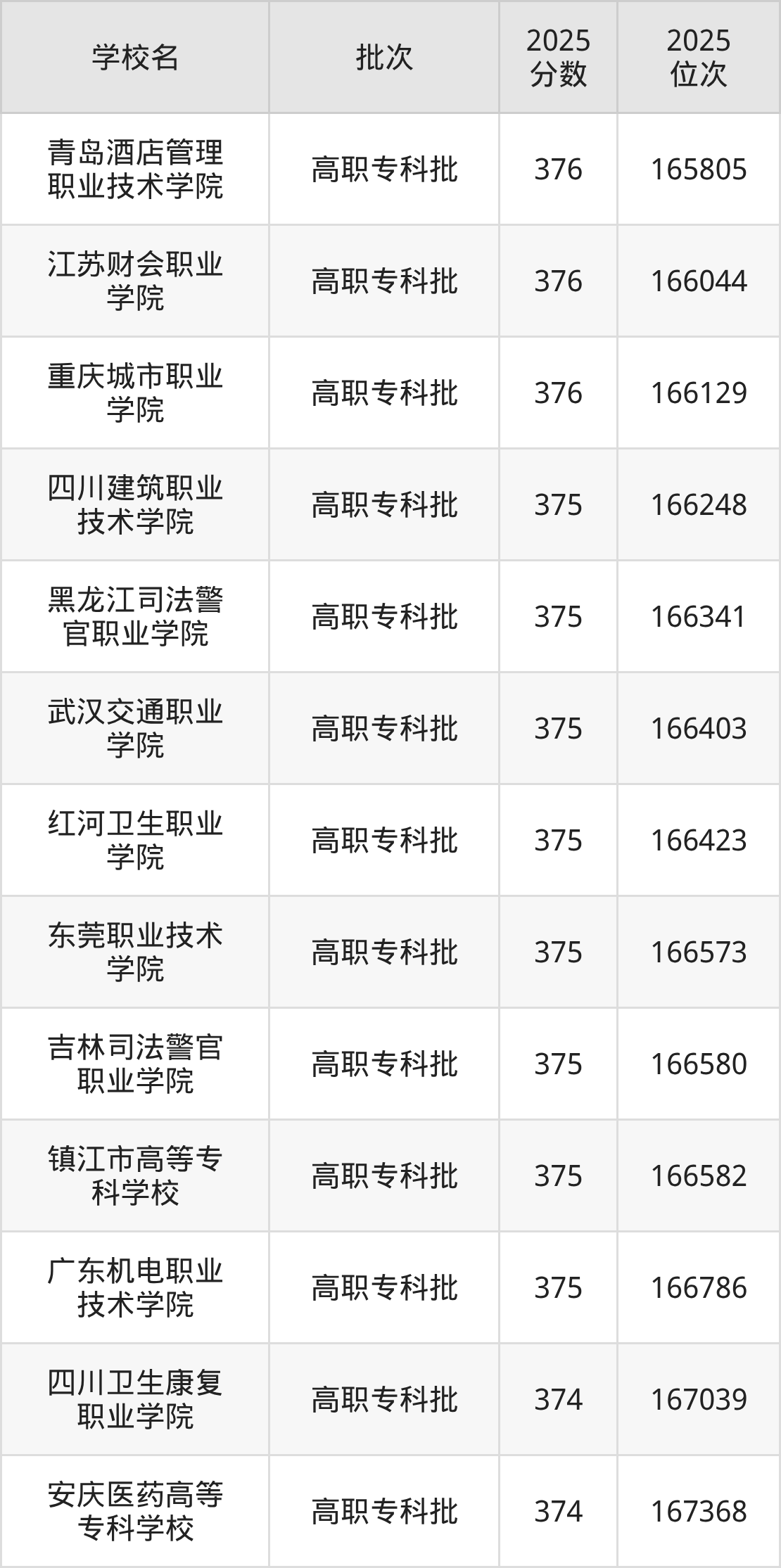 2025年贵州高考物理类375分(166248名~166925名)能上的大学有东莞职业技术学院、四川建筑职业技术学院、吉林司法警官职业学院、红河卫生职业学院等。