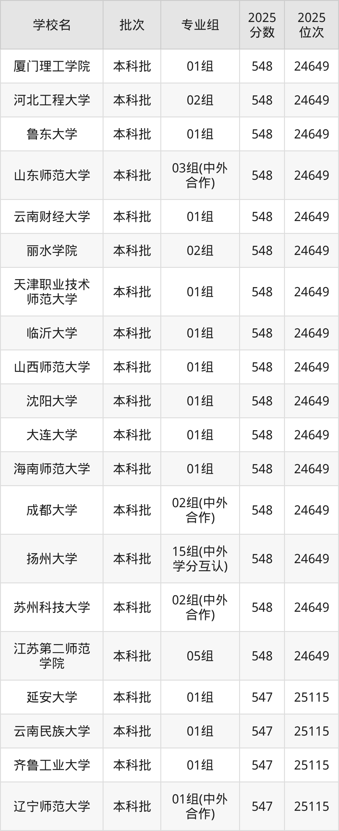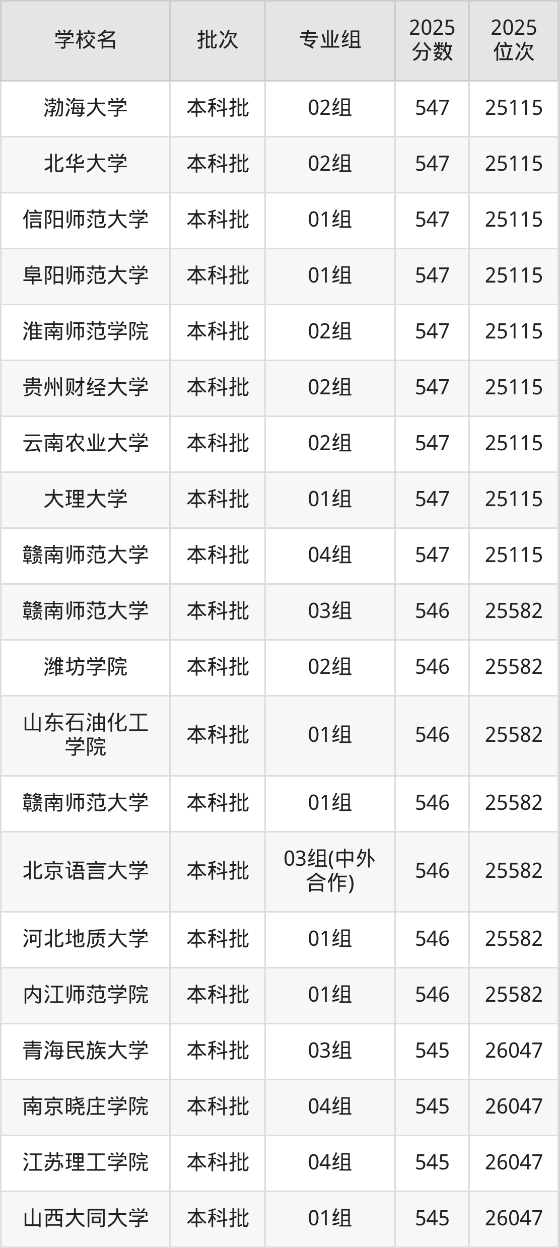 2025年江苏高考历史类546分(25116名~25582名)能上的大学有赣南师范大学01组、赣南师范大学03组、潍坊学院02组、山东石油化工学院01组等。
