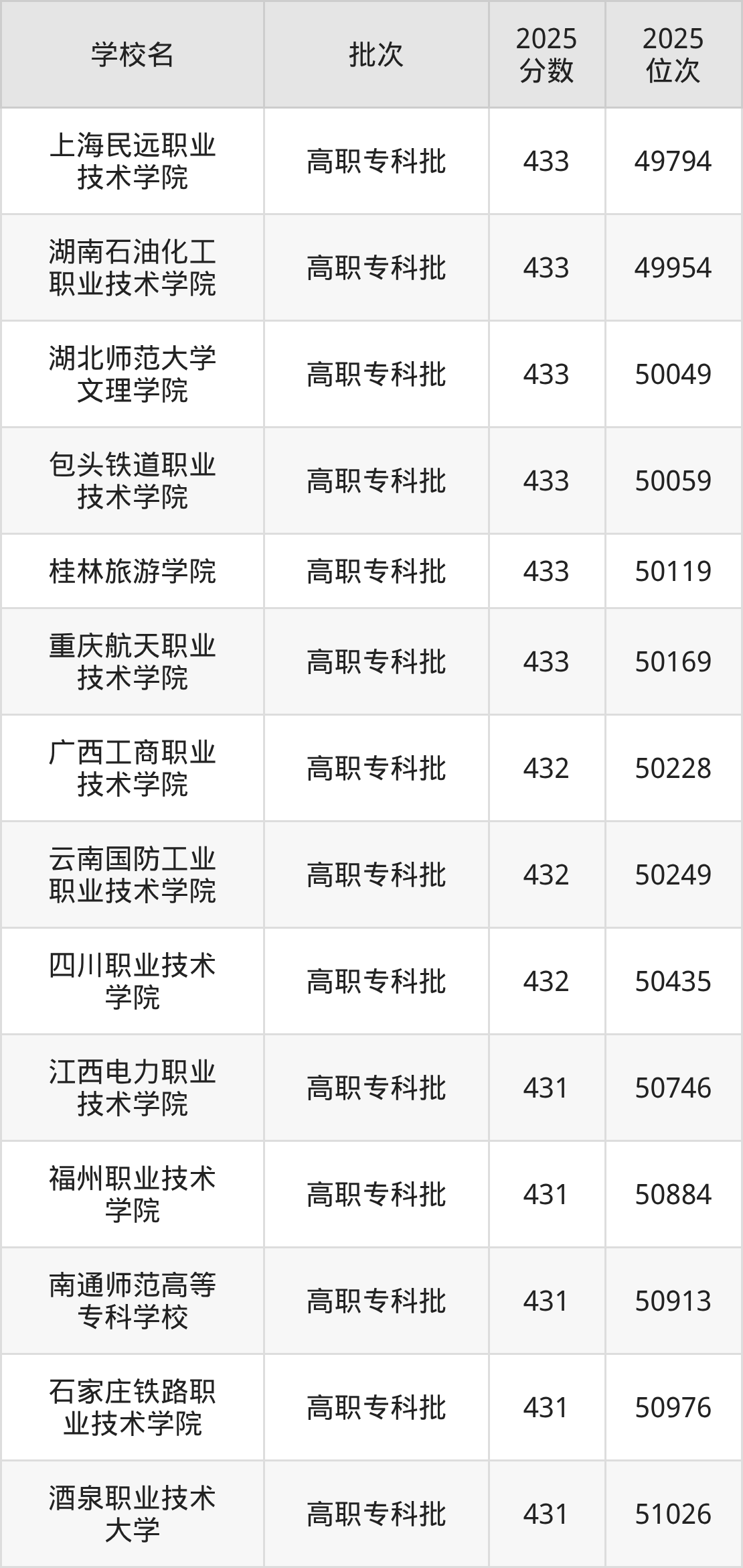 另外录取位次低于该区间(较稳妥)的有江西电力职业技术学院(50746名)、福州职业技术学院(50884名)等;录取位次高于该区间(可冲)的有重庆航天职业技术学院(50169名)、桂林旅游学院(50119名)等。