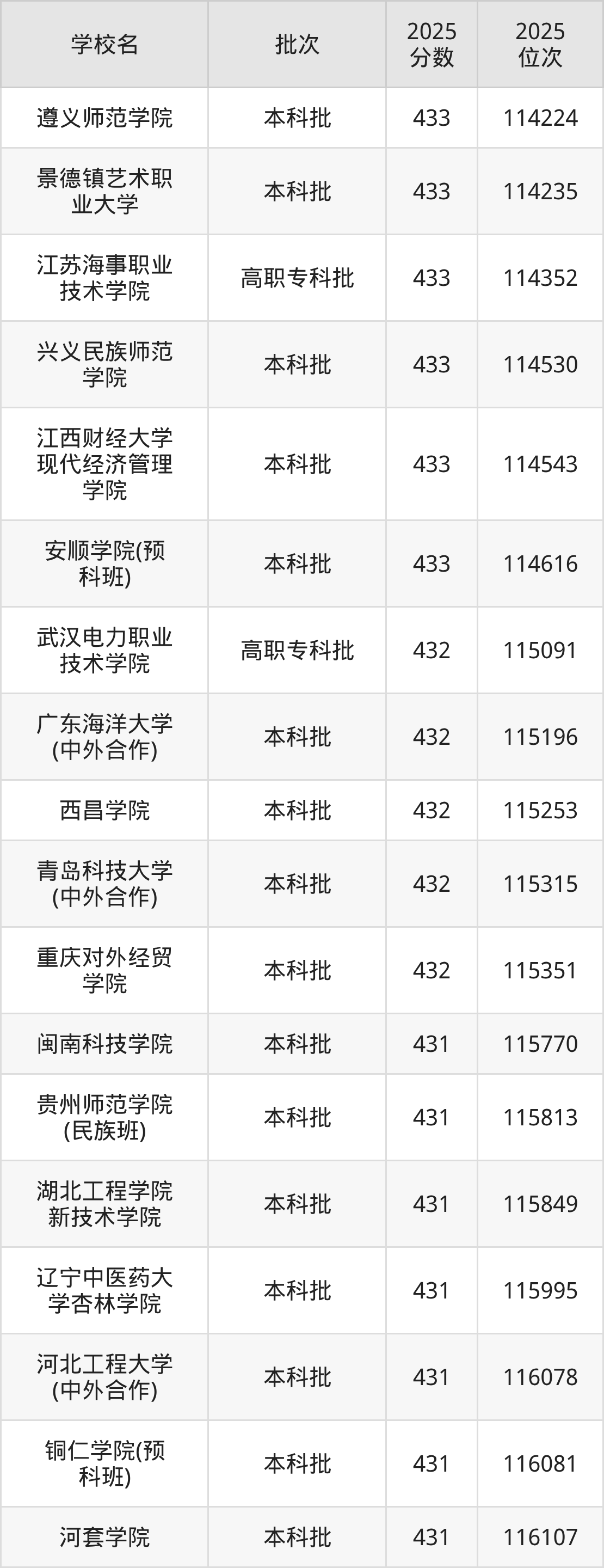 2025年贵州高考物理类432分(114633名~115643名)能上的大学有广东海洋大学(中外合作)、重庆对外经贸学院、武汉电力职业技术学院、西昌学院等。