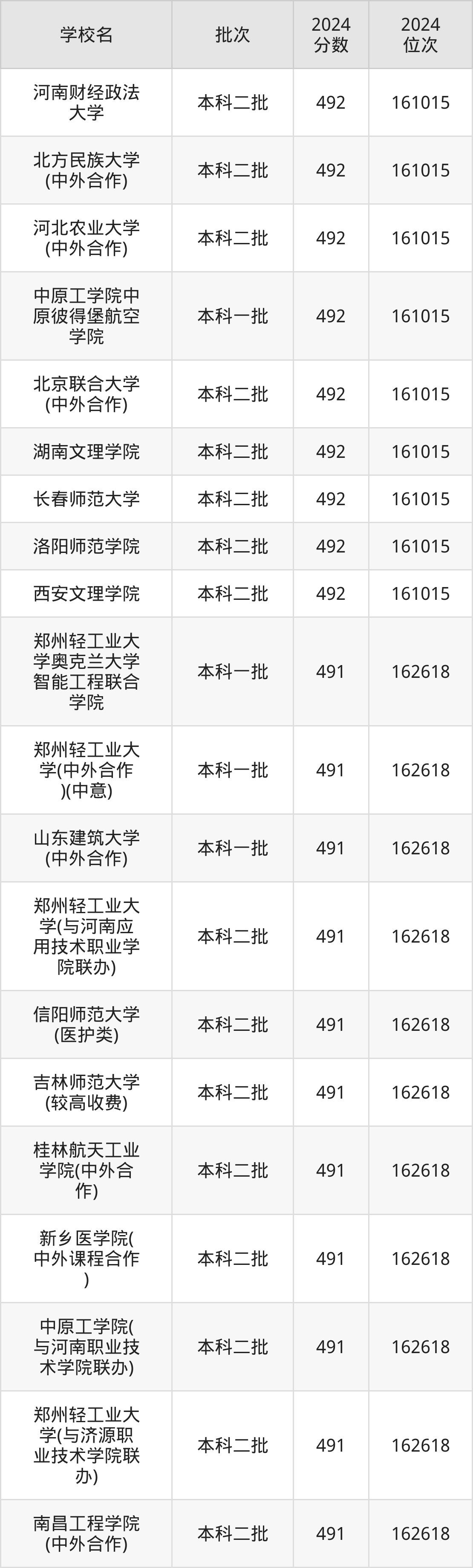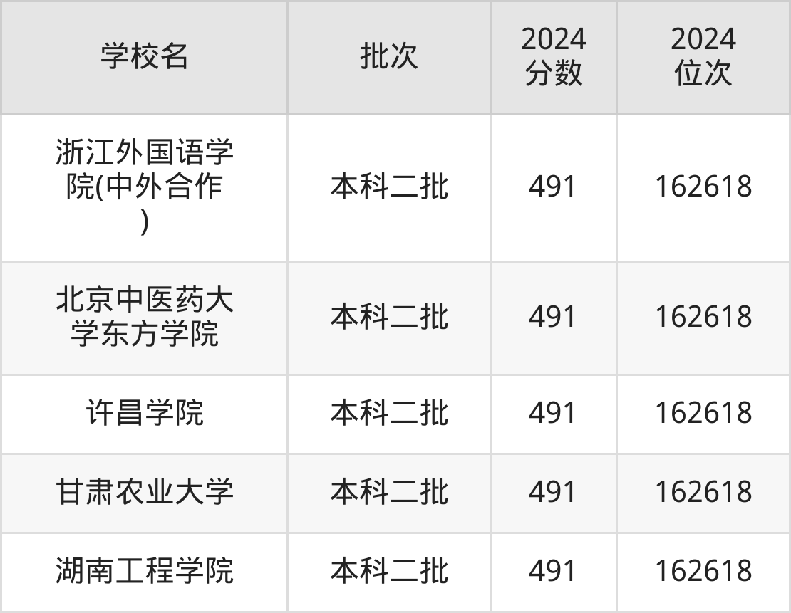 2024年河南高考理科491分(161016名~162618名)能上的大学有湖南工程学院、甘肃农业大学、许昌学院、北京中医药大学东方学院等。