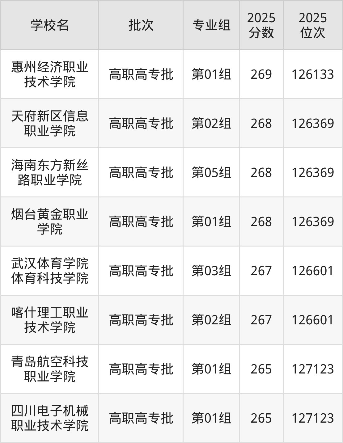 2025年湖北高考历史类266分(126602名~126839名)录取位次低于该区间(较稳妥)的有青岛航空科技职业学院第01组(127123名)、四川电子机械职业技术学院第01组(127123名)等;录取位次高于该区间(可冲)的有喀什理工职业技术学院第02组(126601名)、武汉体育学院体育科技学院第03组(126601名)等。