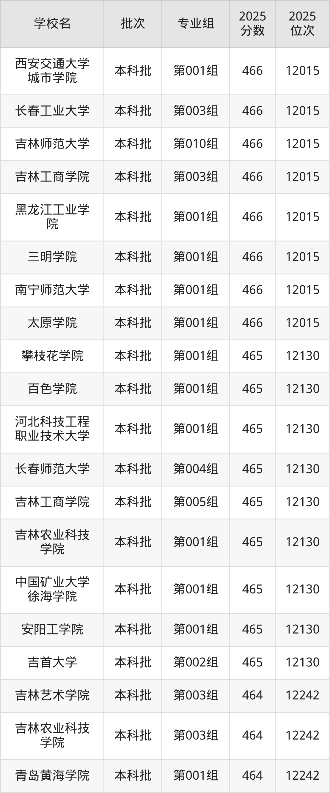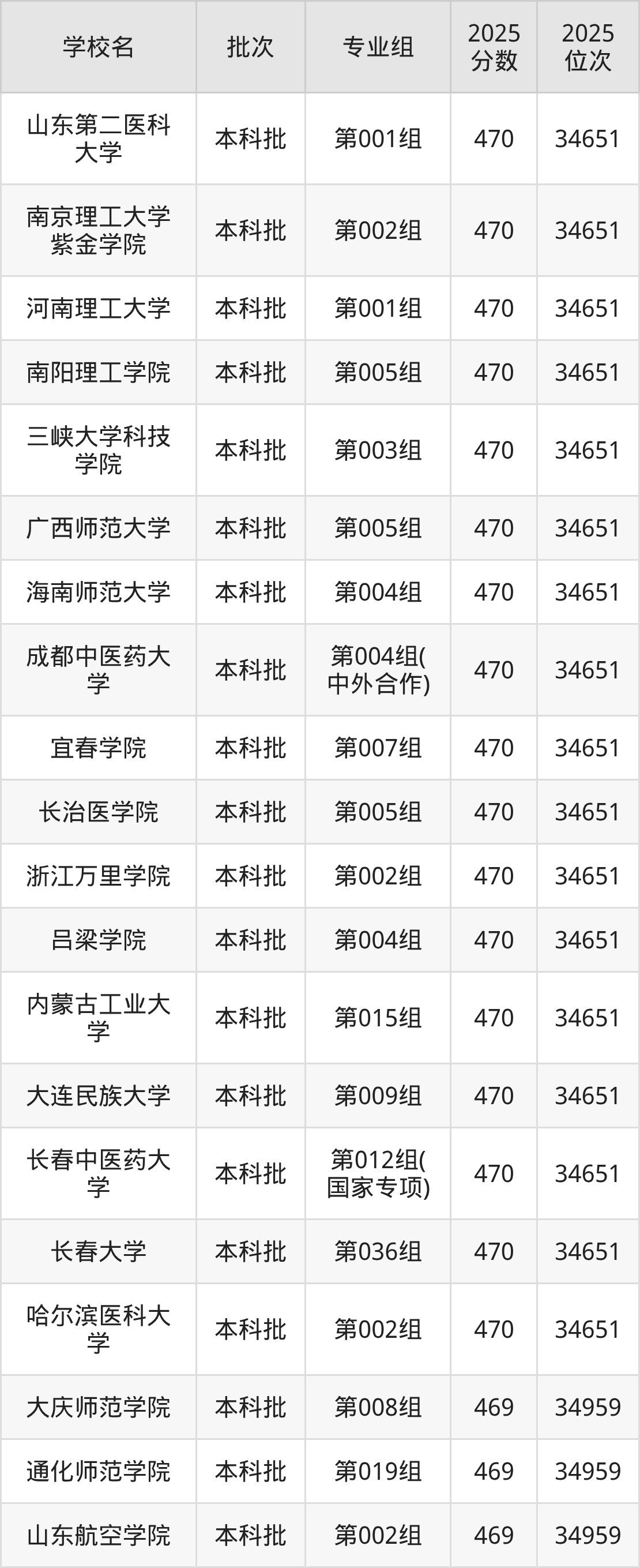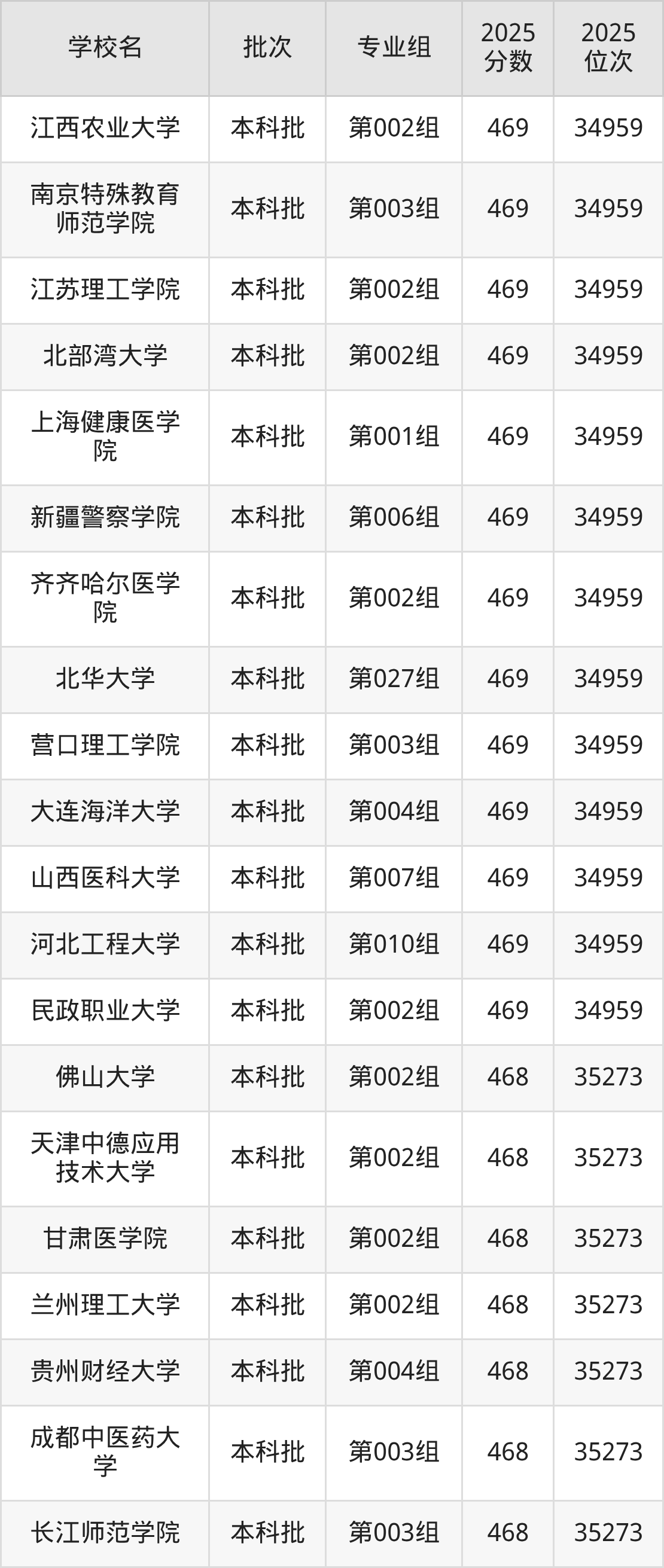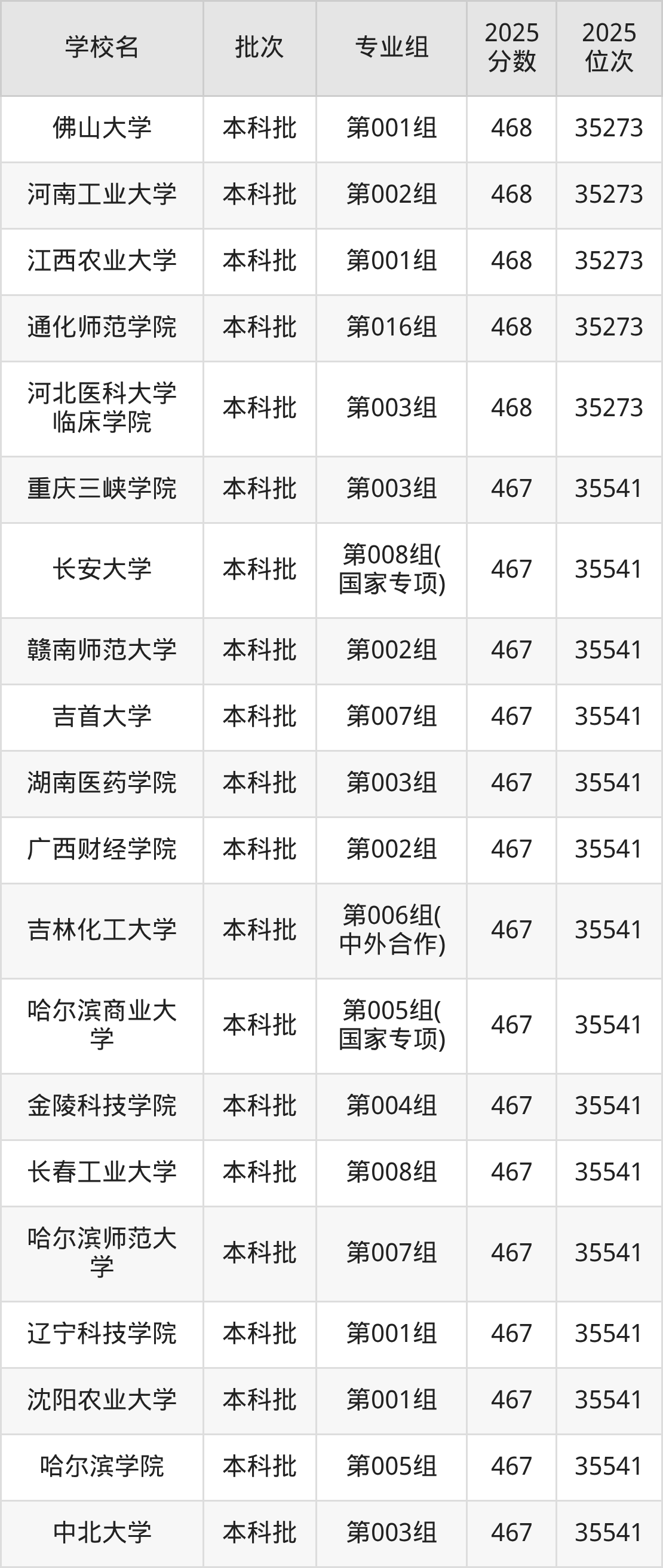 2025年吉林高考物理类468分(34960名~35273名)能上的大学有天津中德应用技术大学第002组、河北医科大学临床学院第003组、通化师范学院第016组、江西农业大学第001组等。