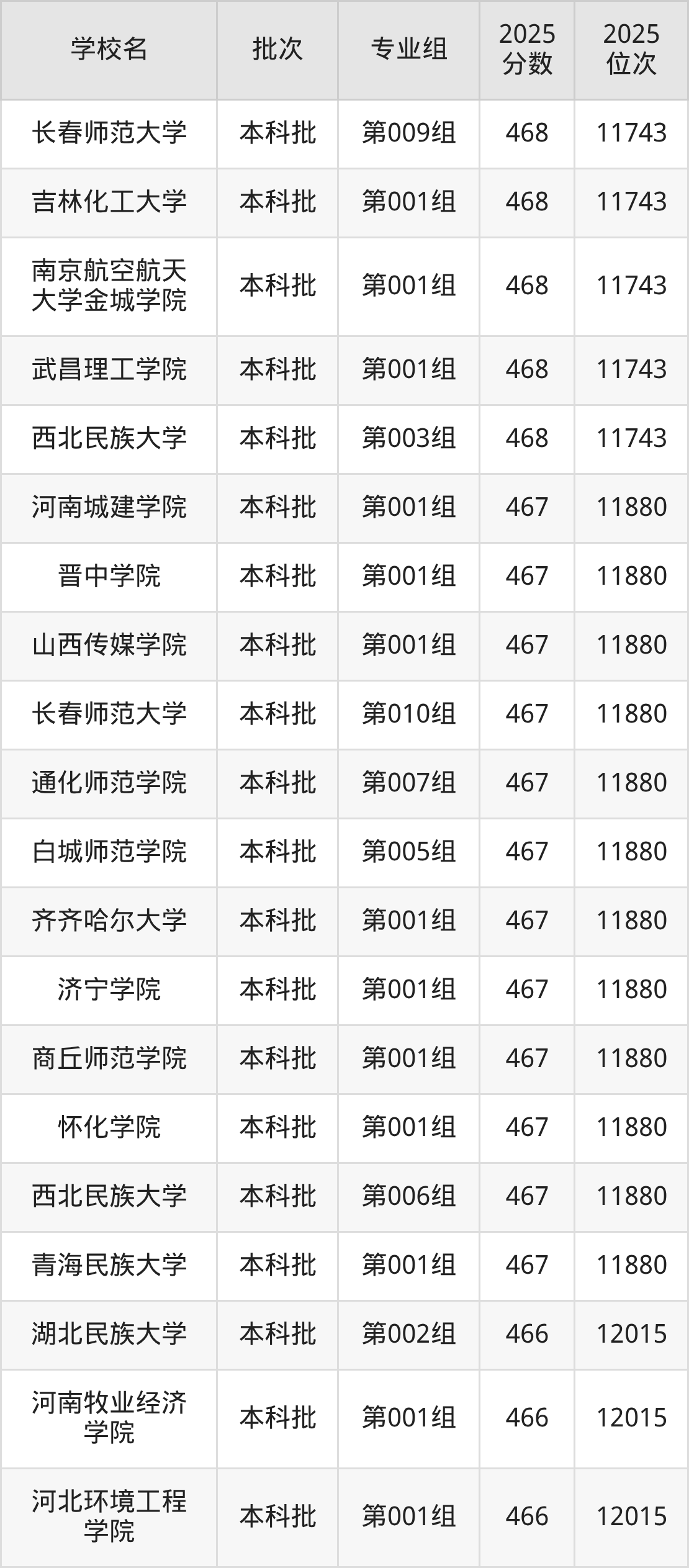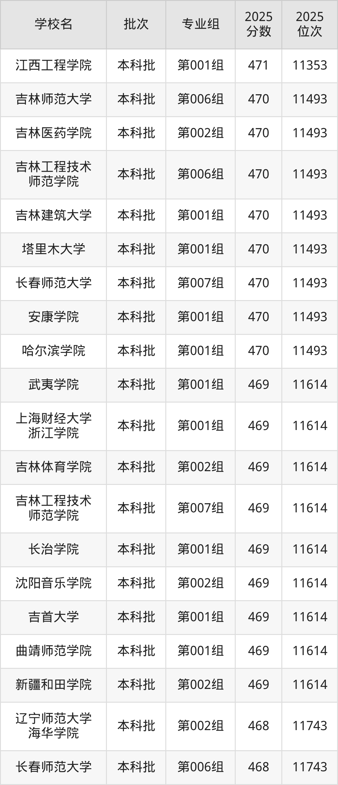 2025年吉林高考历史类468分(11615名~11743名)能上的大学有辽宁师范大学海华学院第002组、长春师范大学第006组、长春师范大学第009组、吉林化工大学第001组等。