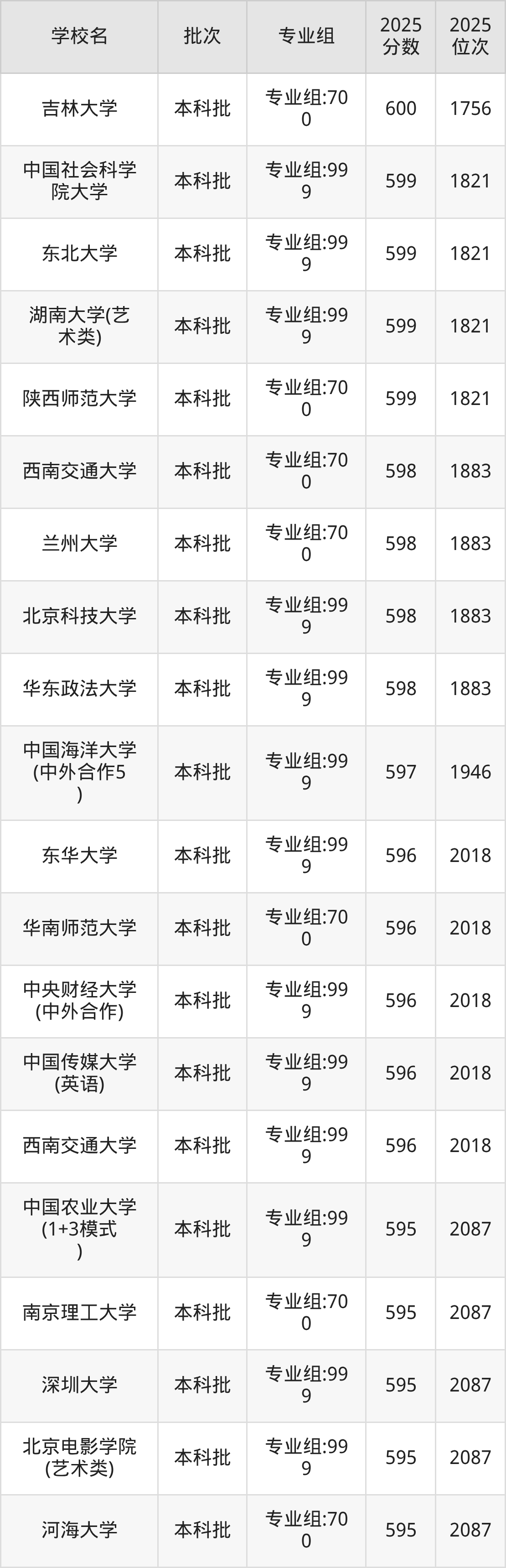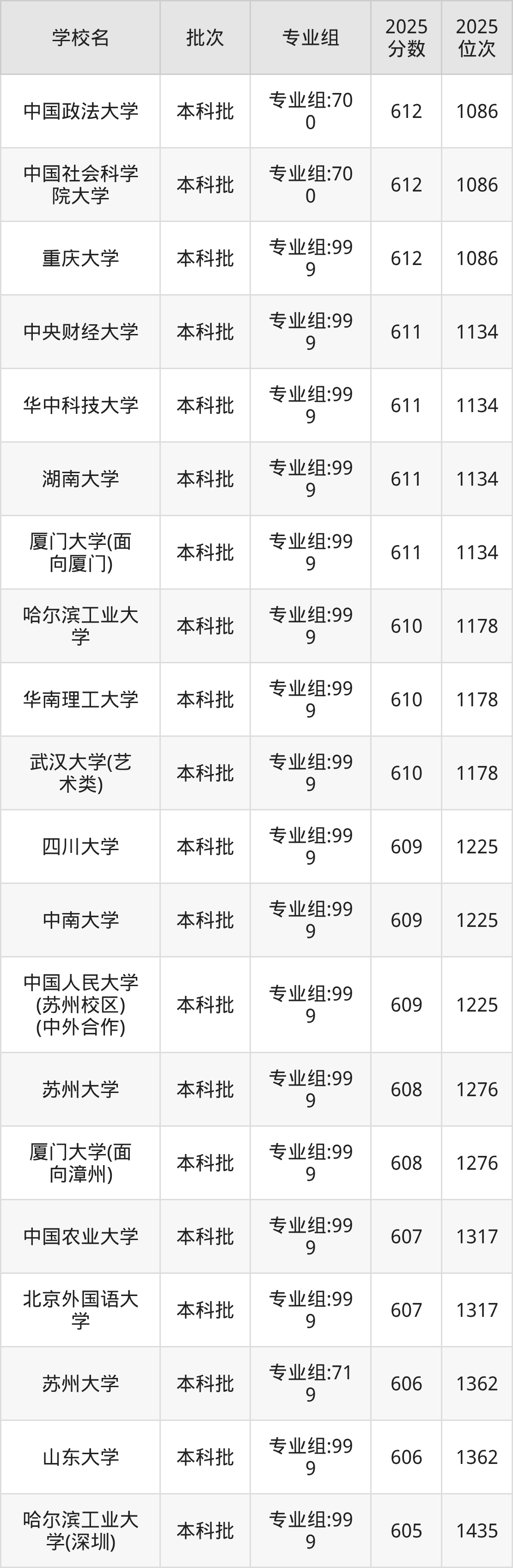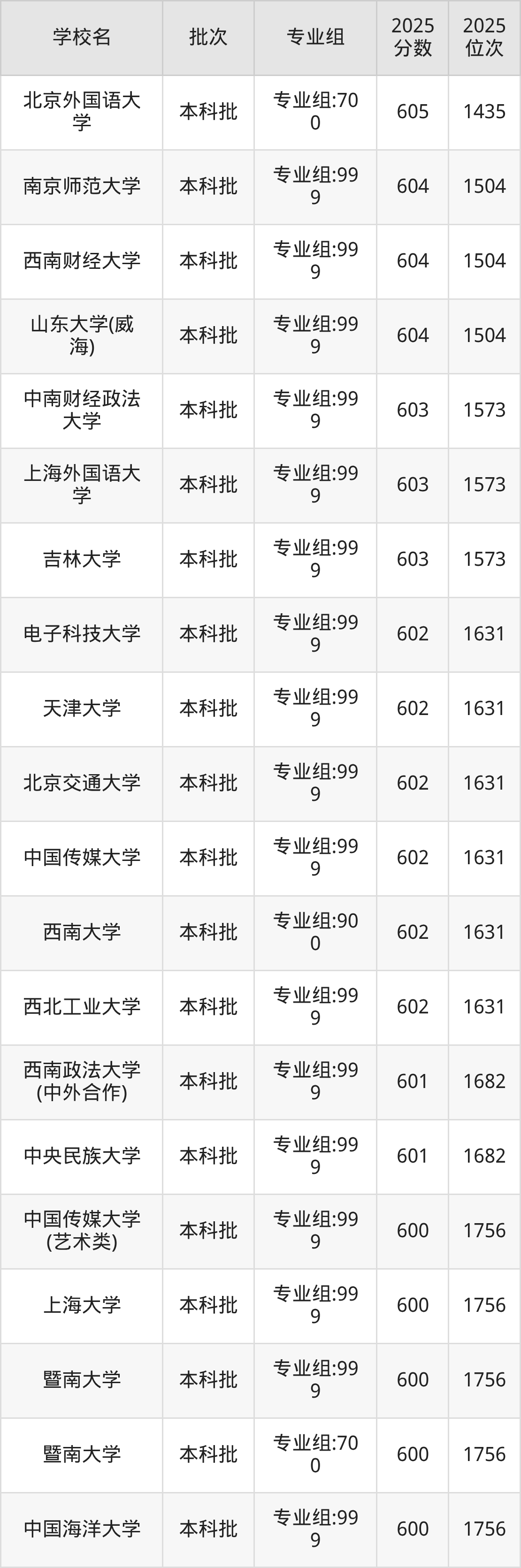 另外录取位次低于该区间(较稳妥)的有中央民族大学专业组:999(1682名)、西南政法大学(中外合作)专业组:999(1682名)等;录取位次高于该区间(可冲)的有吉林大学专业组:999(1573名)、上海外国语大学专业组:999(1573名)等。