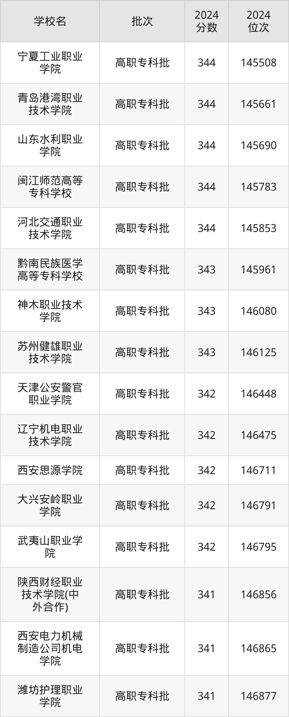 2024年陕西高考理科343分(145937名~146377名)能上的大学有苏州健雄职业技术学院、黔南民族医学高等专科学校、神木职业技术学院。