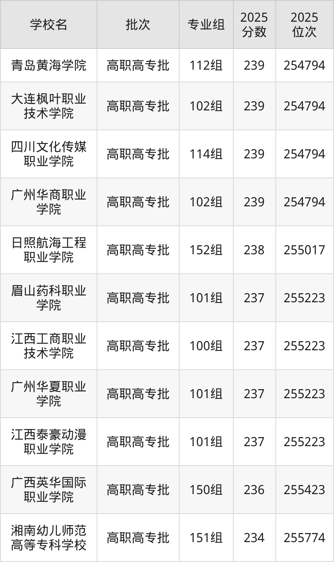 另外录取位次低于该区间(较稳妥)的有湘南幼儿师范高等专科学校151组(255774名)、山东外国语职业技术大学103组(255977名)等;录取位次高于该区间(可冲)的有江西泰豪动漫职业学院101组(255223名)、广州华夏职业学院101组(255223名)等。