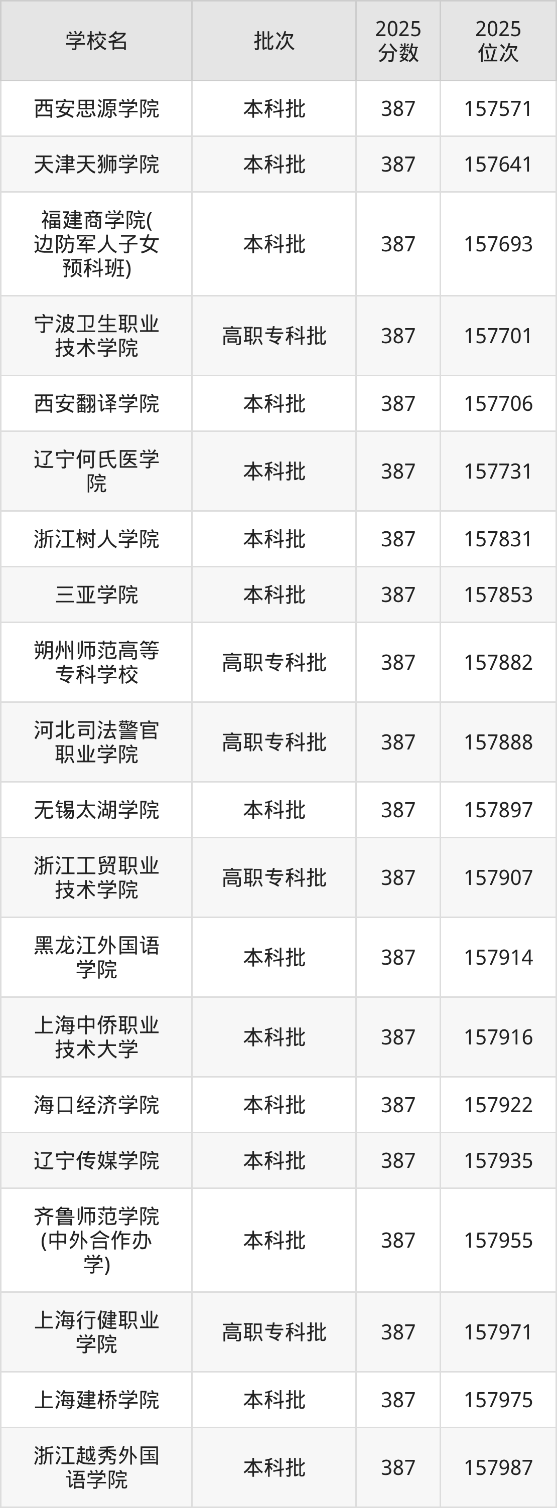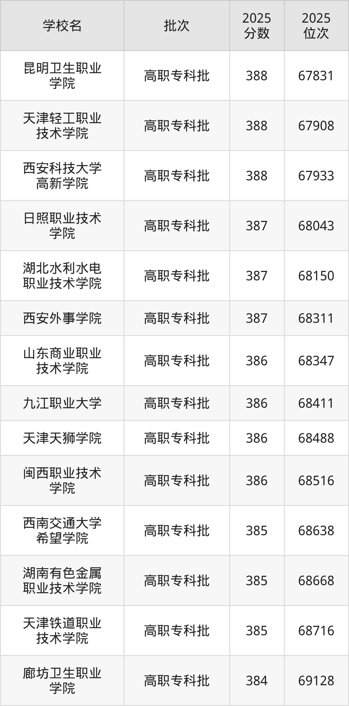 2025年贵州高考历史类386分(68316名~68633名)能上的大学有闽西职业技术学院、九江职业大学、天津天狮学院、山东商业职业技术学院。