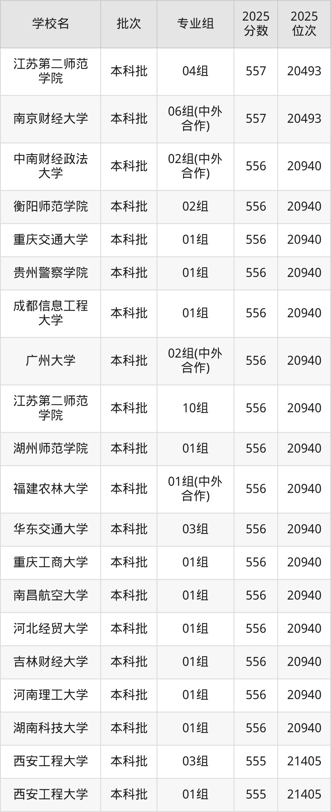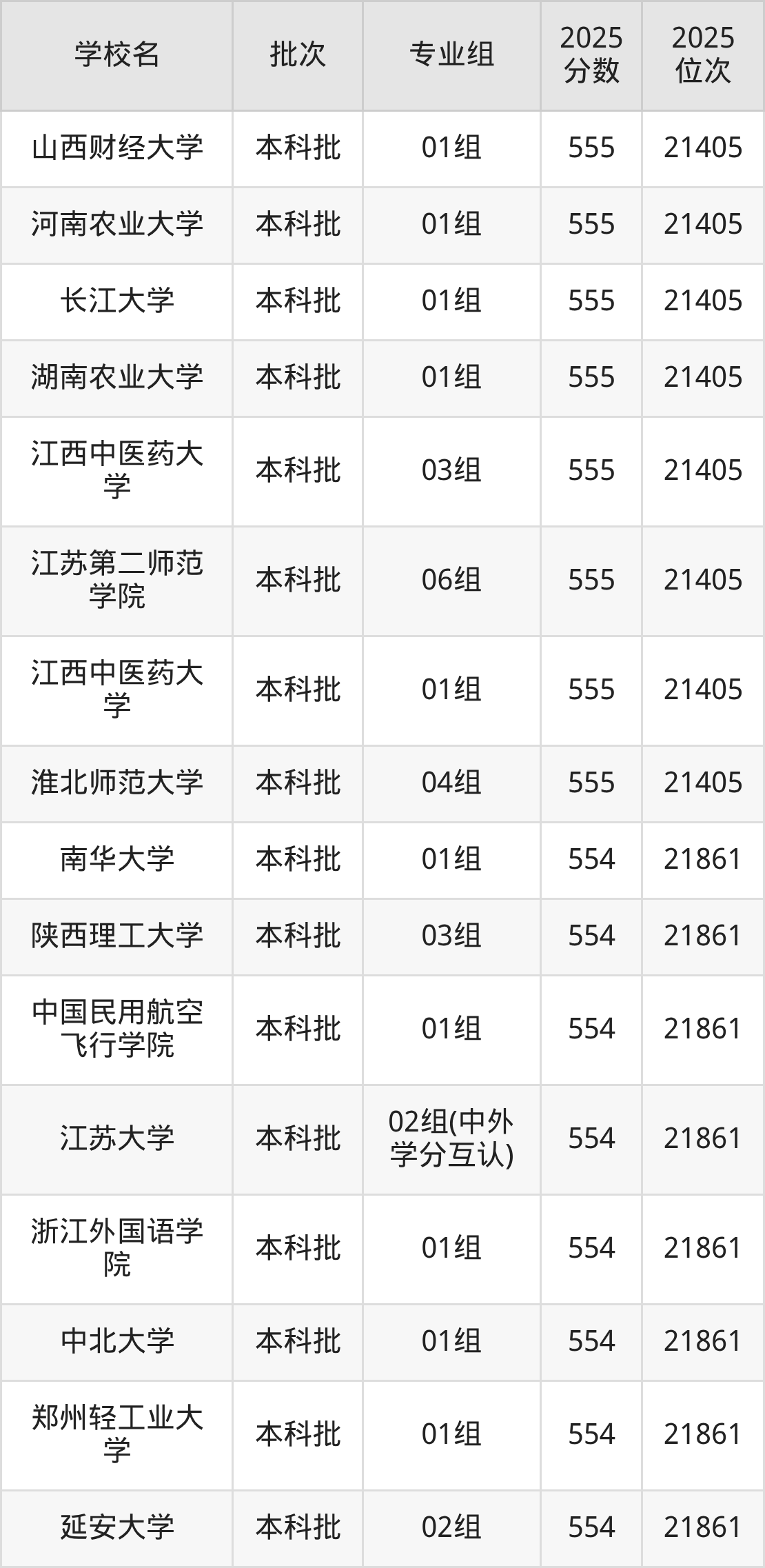 2025年江苏高考历史类555分(20941名~21405名)能上的大学有江苏第二师范学院06组、淮北师范大学04组、江西中医药大学01组、江西中医药大学03组等。