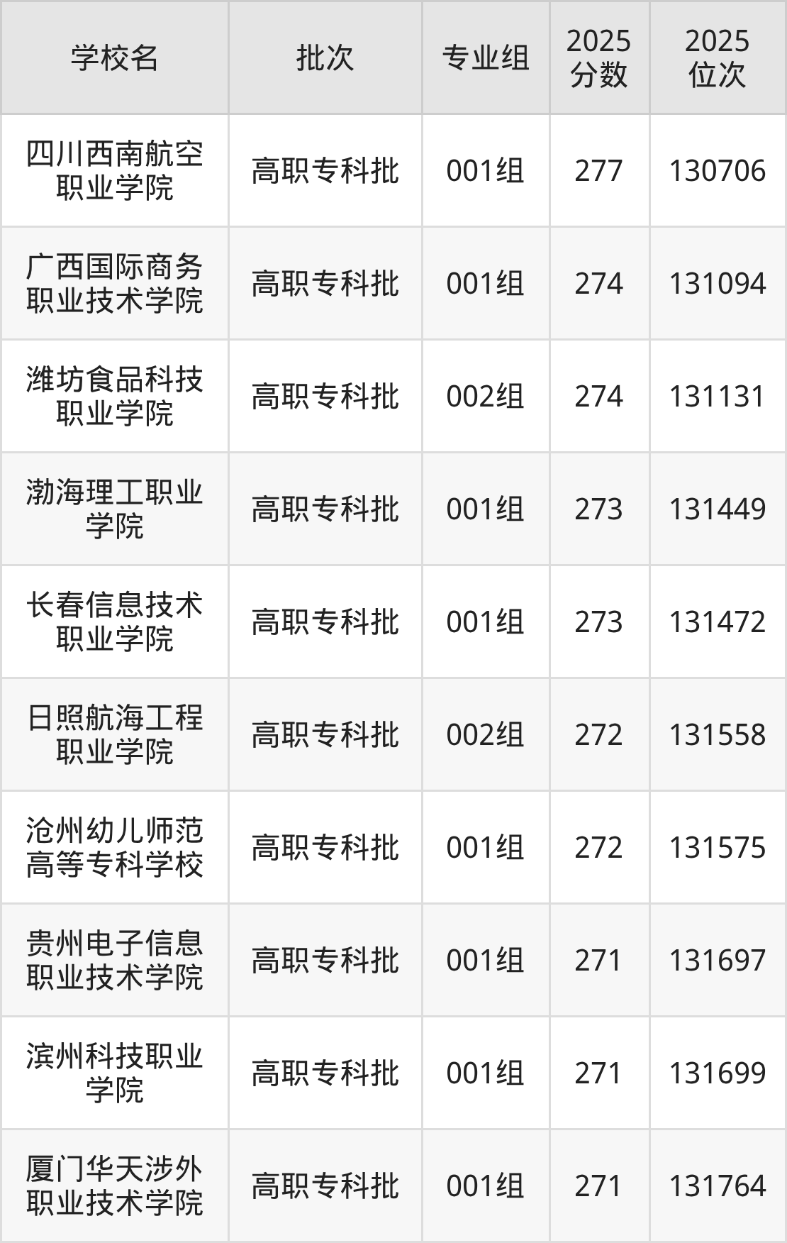 另外录取位次低于该区间(较稳妥)的有渤海理工职业学院001组(131449名)、长春信息技术职业学院001组(131472名)等;录取位次高于该区间(可冲)的有四川西南航空职业学院001组(130706名)、四川科技职业学院001组(130562名)等。