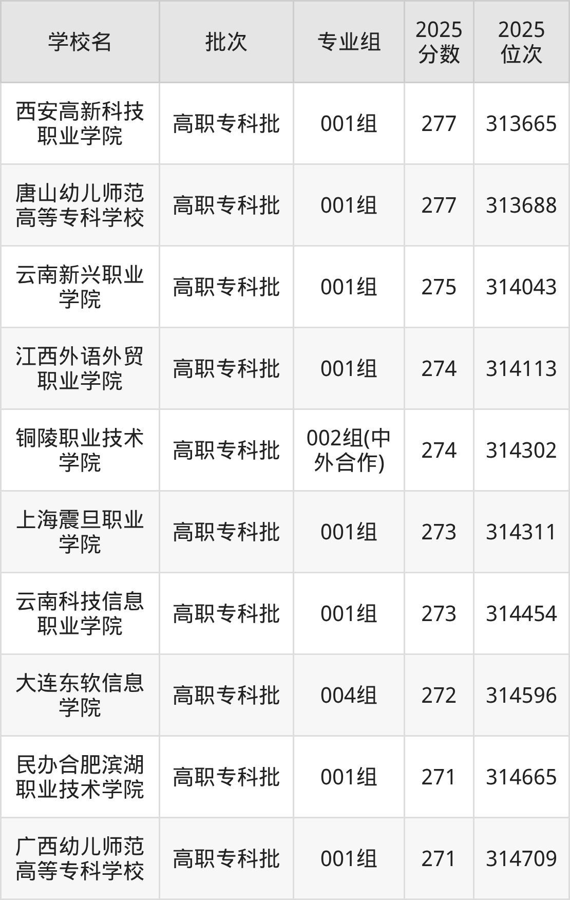 2025年安徽高考物理类274分(314111名~314304名)能上的大学有江西外语外贸职业学院001组、铜陵职业技术学院002组(中外合作)。