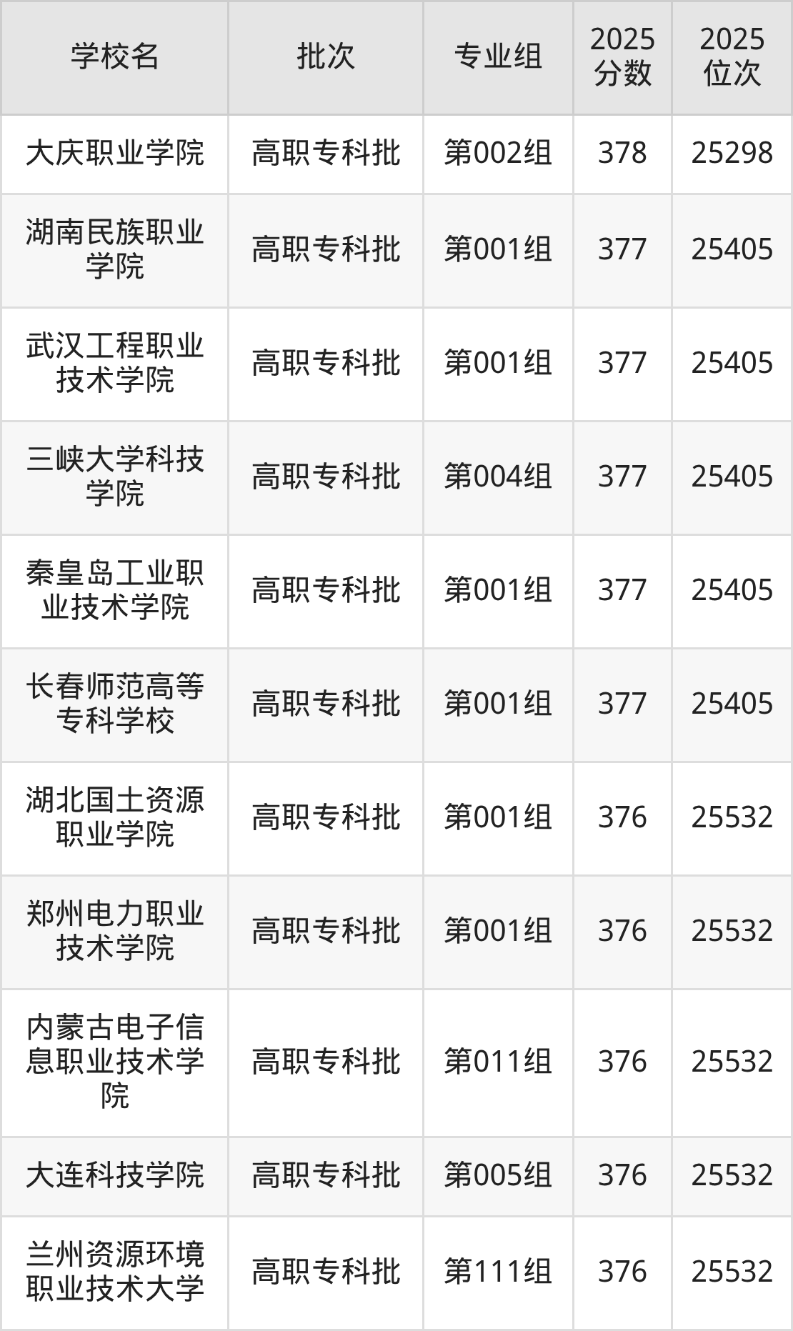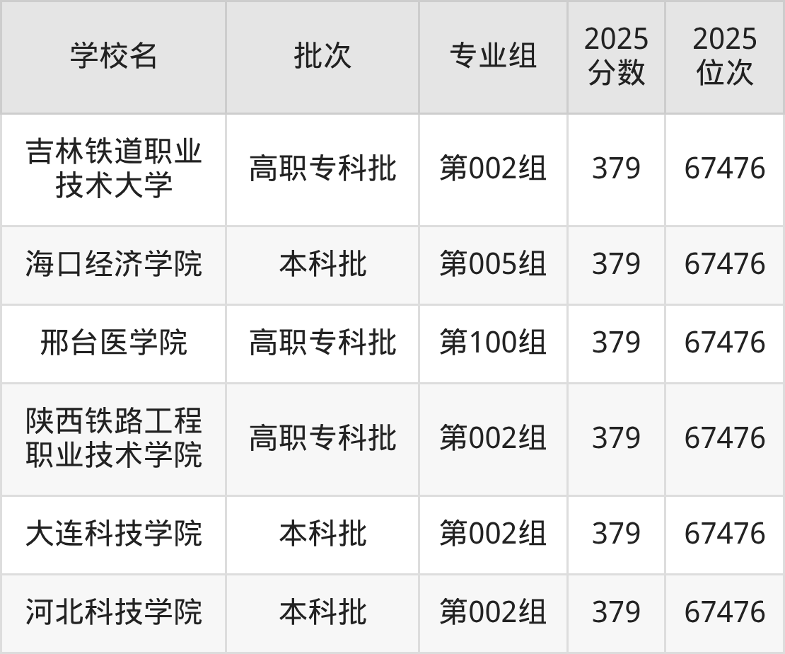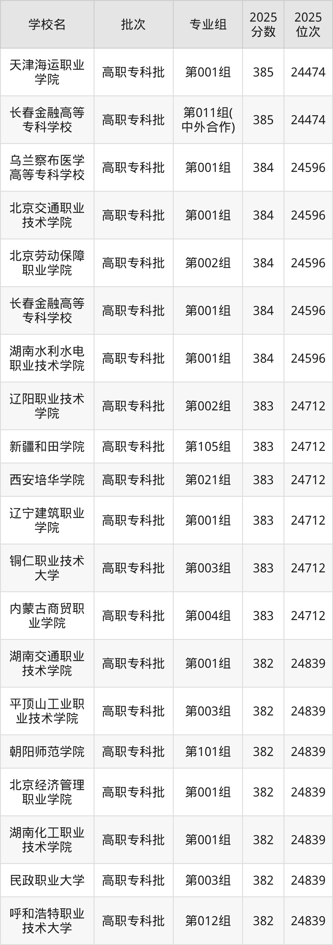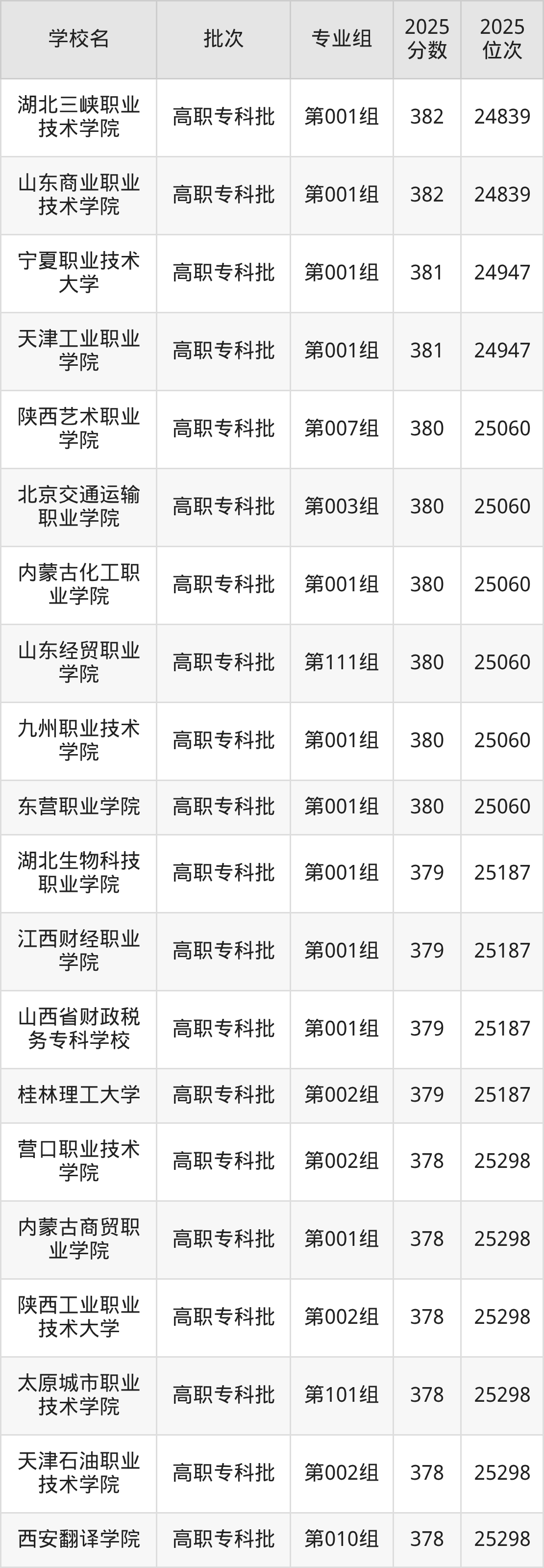 2025年内蒙古高考历史类380分(24948名~25060名)能上的大学有山东经贸职业学院第111组、陕西艺术职业学院第007组、东营职业学院第001组、北京交通运输职业学院第003组等。