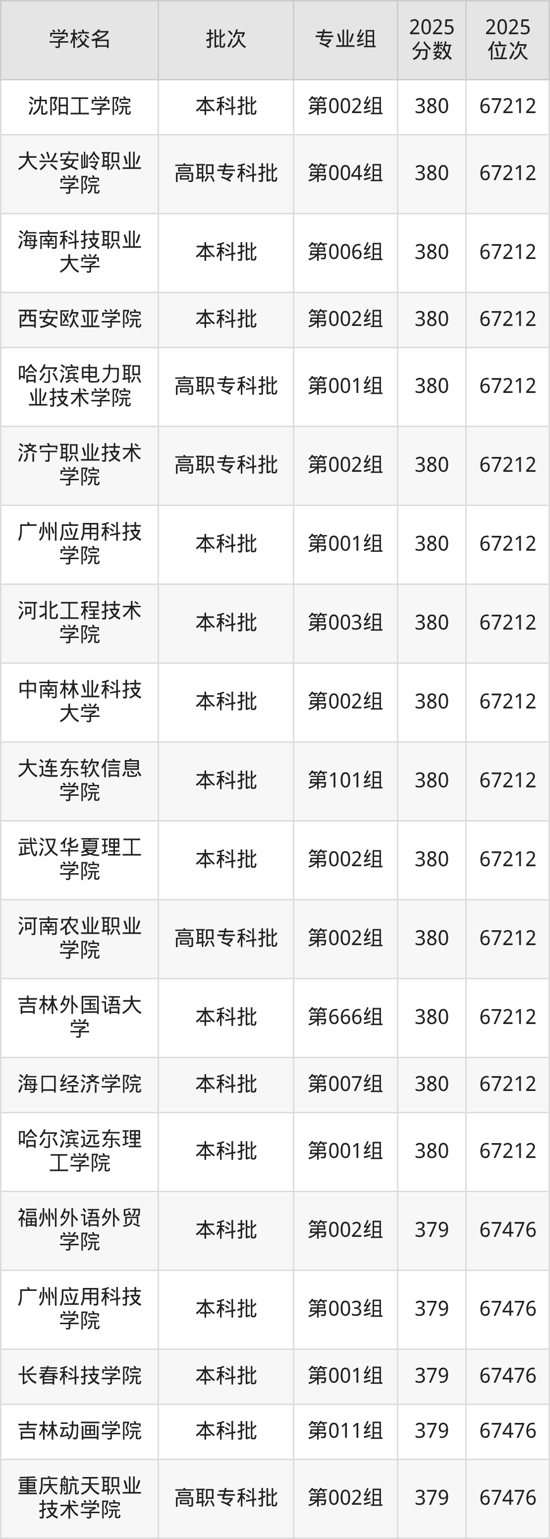 2025年内蒙古高考物理类380分(66941名~67212名)能上的大学有哈尔滨电力职业技术学院第001组、沈阳工学院第002组、河南农业职业学院第002组、吉林外国语大学第666组等。