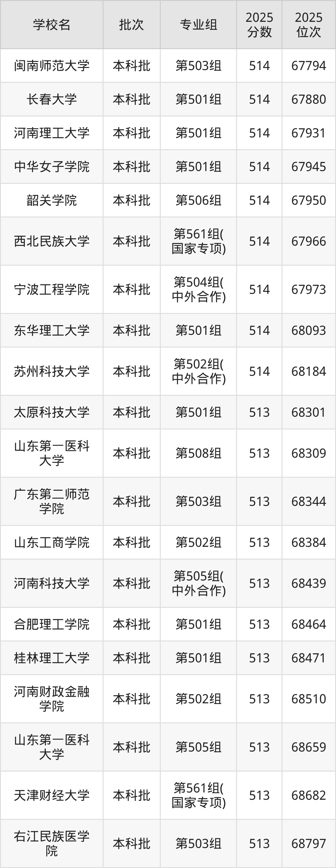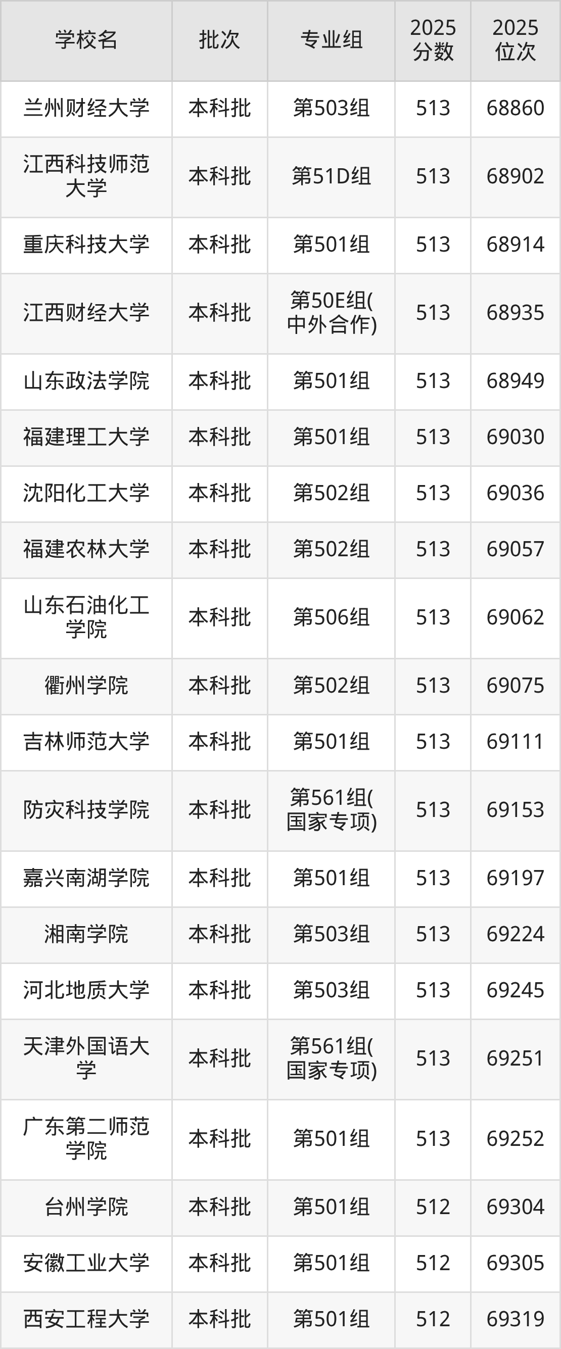 2025年江西高考物理类513分(68185名~69294名)能上的大学有吉林师范大学第501组、天津财经大学第561组(国家专项)、防灾科技学院第561组(国家专项)、天津外国语大学第561组(国家专项)等。