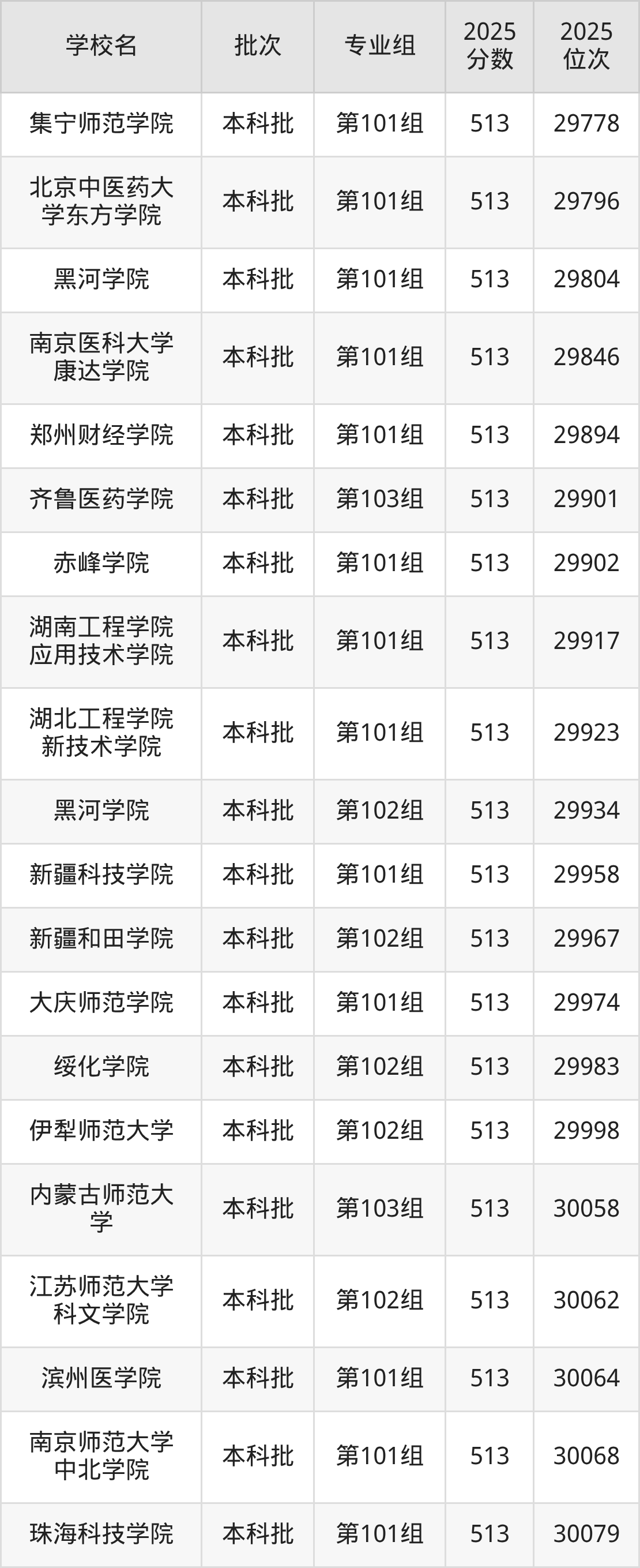 2025年江西高考历史类513分(29544名~30102名)能上的大学有内蒙古师范大学第101组、内蒙古师范大学第103组、赤峰学院第101组、绥化学院第102组等。