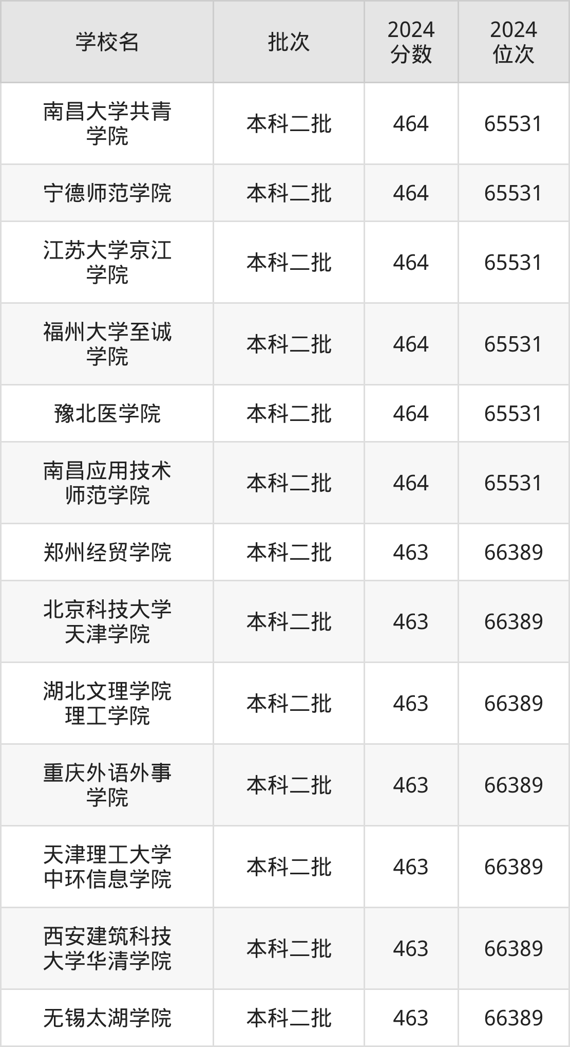 2024年河南高考文科463分(65532名~66389名)能上的大学有西安建筑科技大学华清学院、北京科技大学天津学院、无锡太湖学院、天津理工大学中环信息学院等。