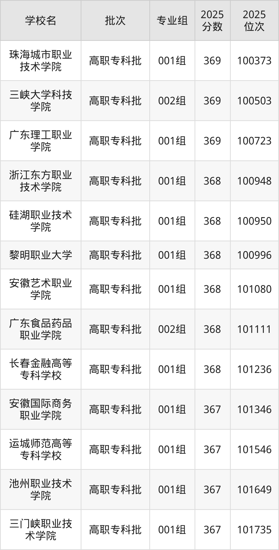 2025年安徽高考历史类368分(100839名~101295名)能上的大学有长春金融高等专科学校001组、广东食品药品职业学院002组、硅湖职业技术学院001组、黎明职业大学001组等。